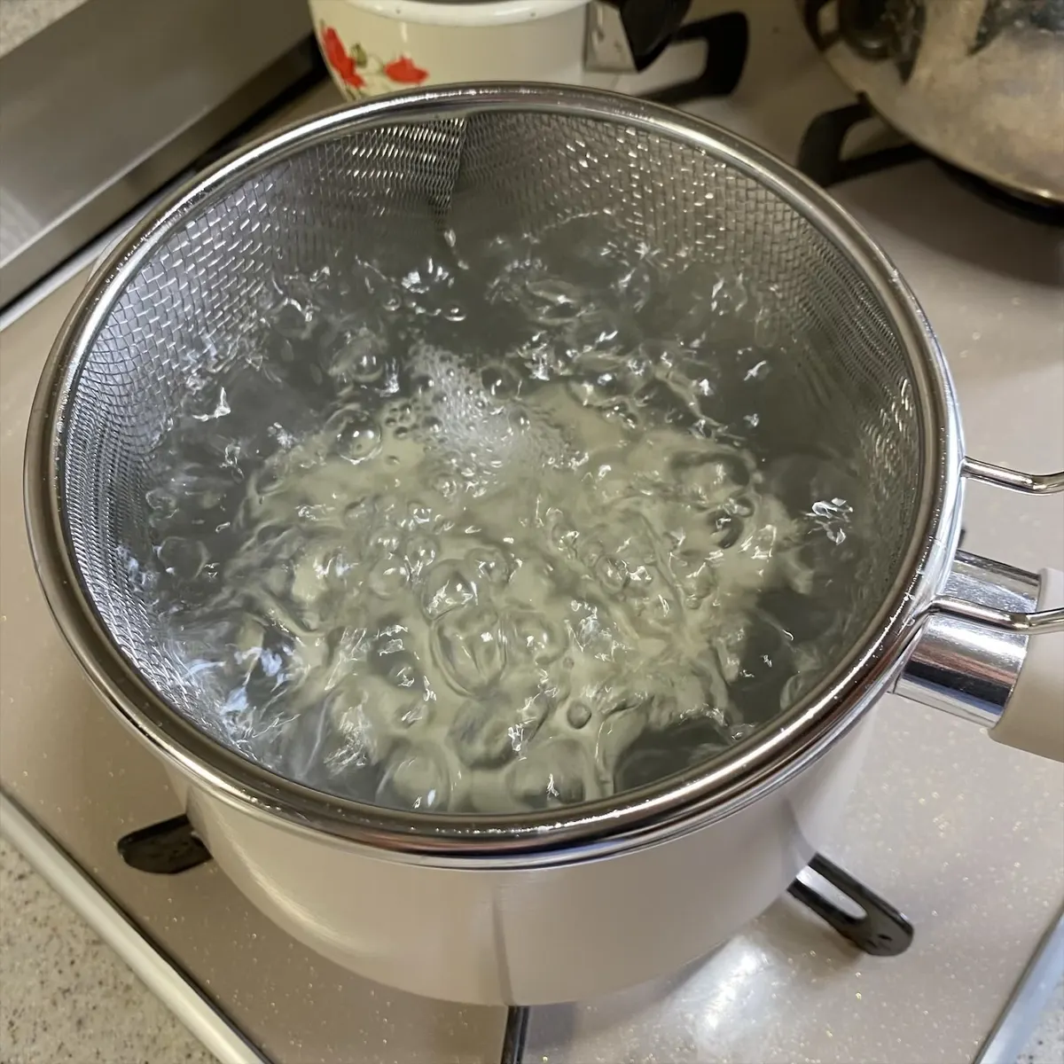 6️⃣強火にしすぎるとストレーナーの横からお湯がボコボコ吹き出るのと、ストレーナーの持ち手がアチアチになる。