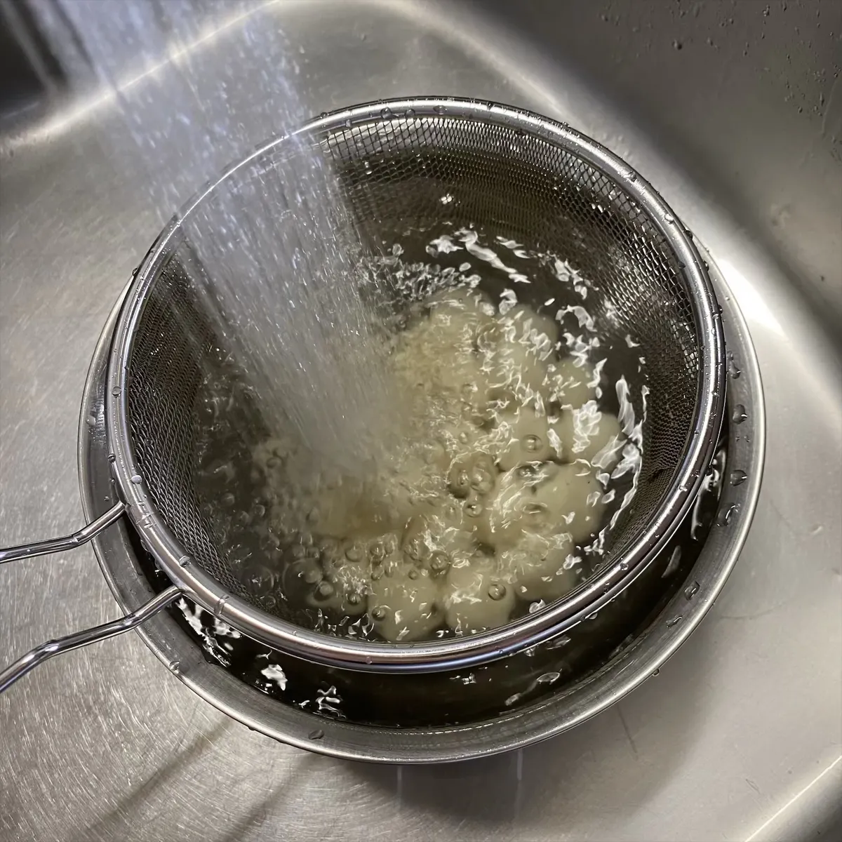 3️⃣10役マルチポットにストレーナーをかましてお湯をたっぷり沸騰させて丸めた白玉を全部入れる。