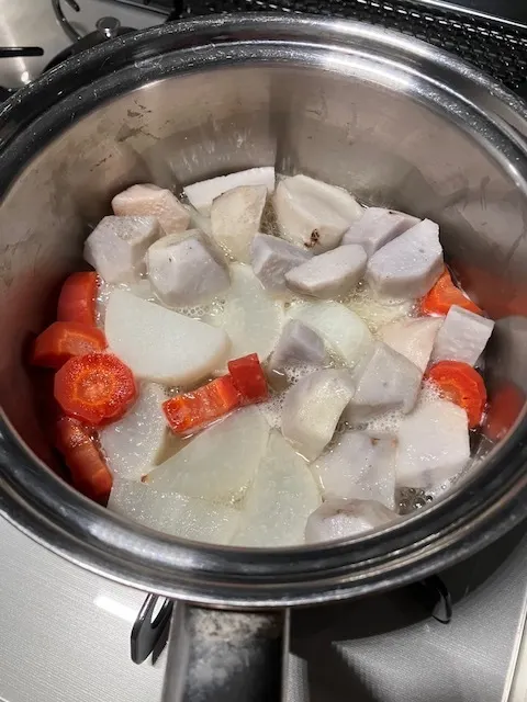 人参と大根が少し柔らかくなれば さといもを投入