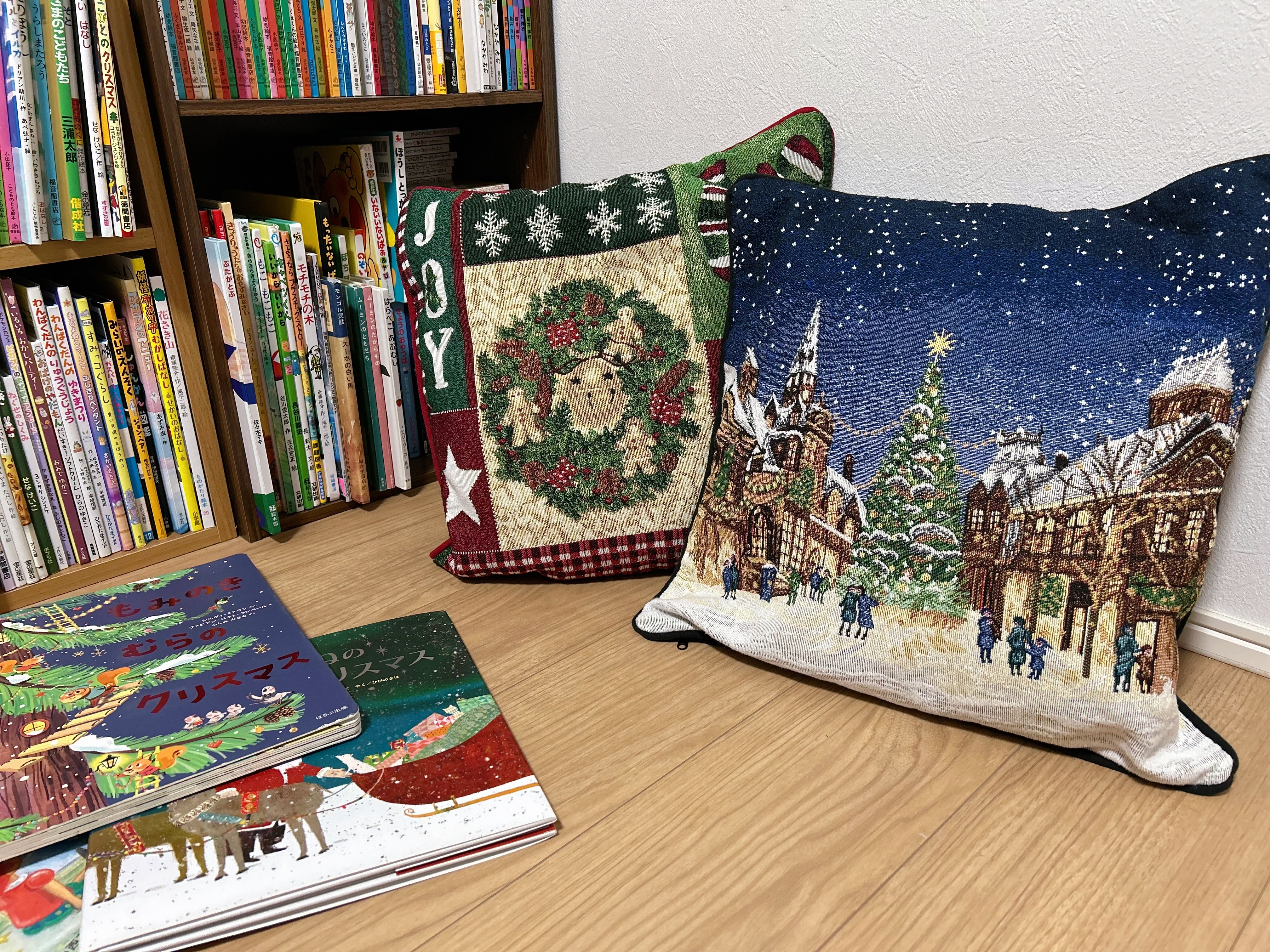 我が家 リビングも寝室も絵本だらけです😆  娘も サンタさん来るようワクワクした気持ちになってくれてたら 嬉しい〜 素敵なクッション販売してくれた ニトリ様様 です🙏🥹