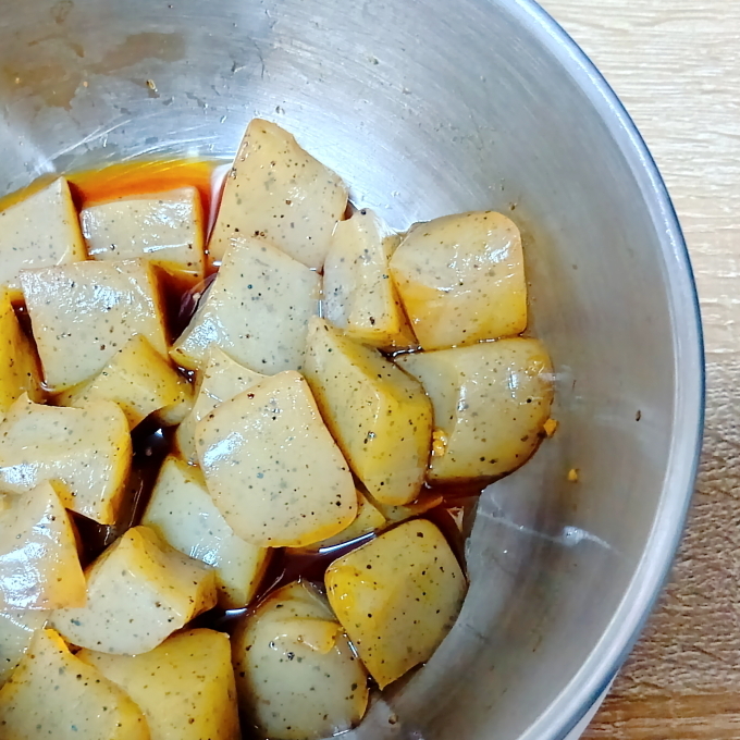 今回、片栗粉がかなりダマになってしまったので、加熱後に焼き肉のタレを軽くからめ、200度で3~5分再加熱しました。
