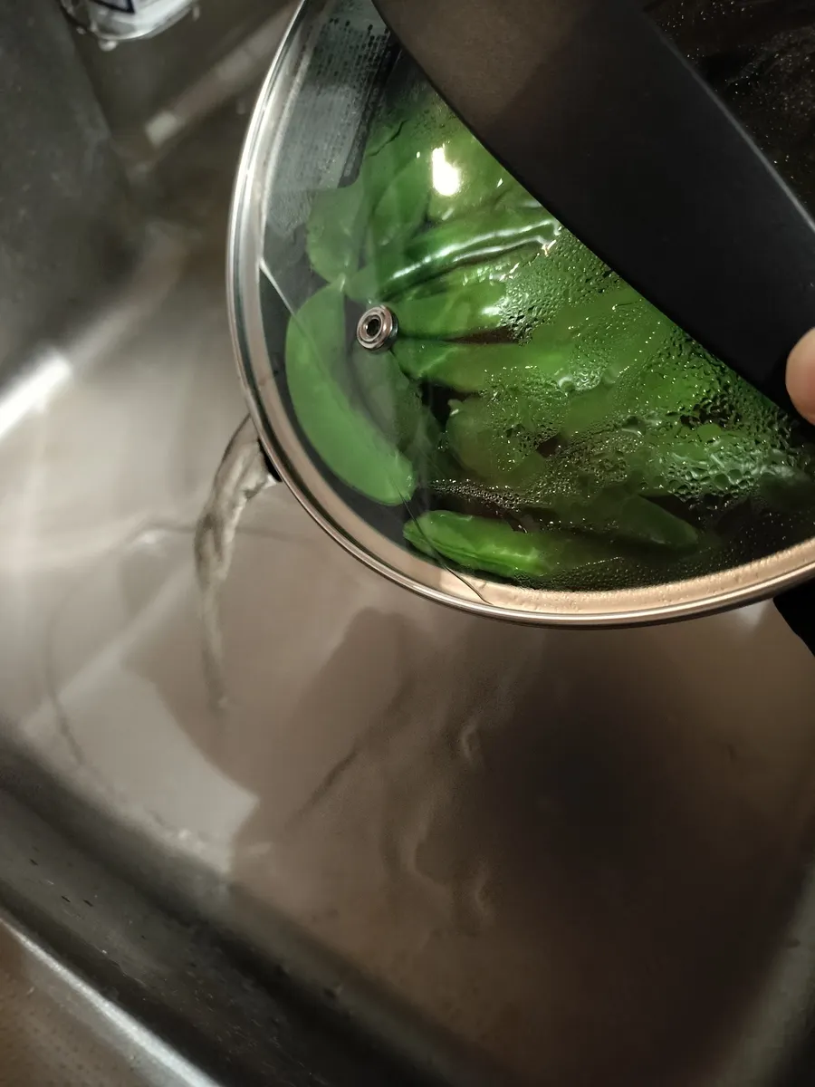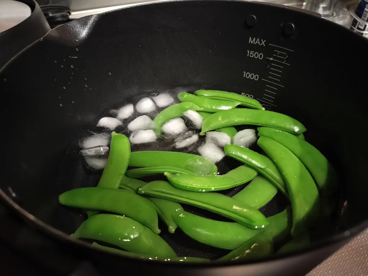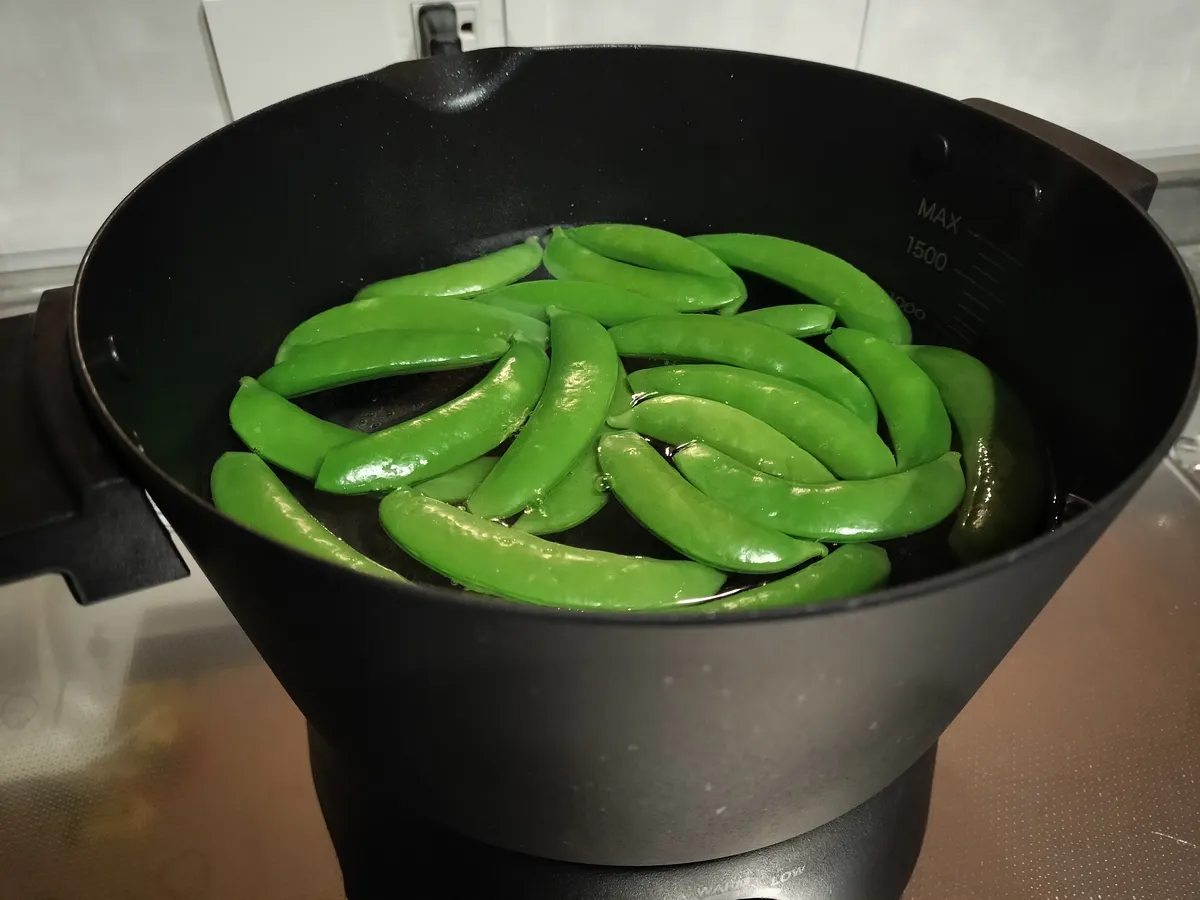 ③沸いたらスナップエンドウ投入して2分くらい茹でる