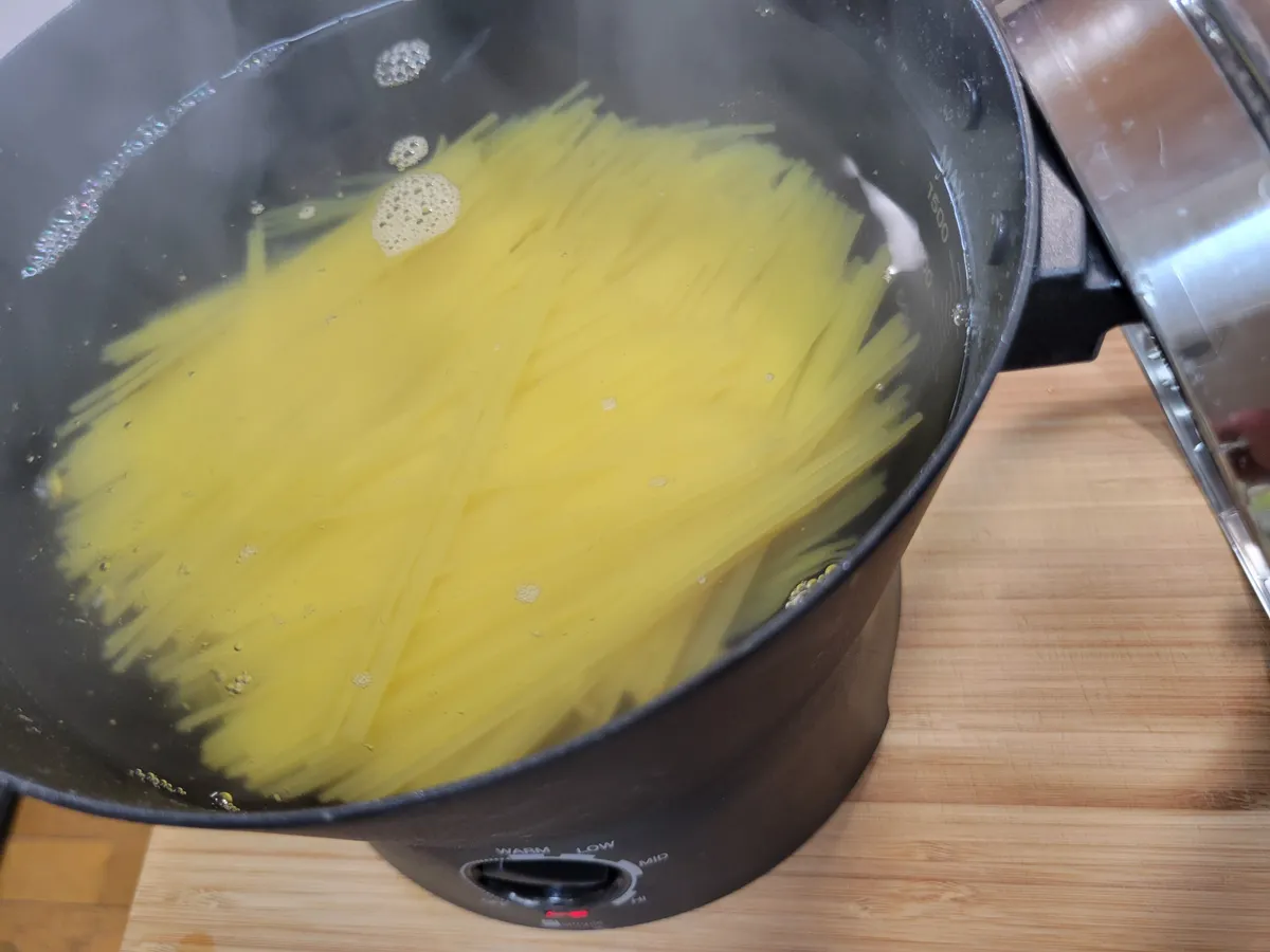 ④②の1台10役マルチ調理ポットのお湯に岩塩(塩でOK)を大さじ1杯入れ、グツグツ沸騰したらパスタを半分に折って入れる。※この時蓋はしない。蓋をすると水が溢れます💧💦