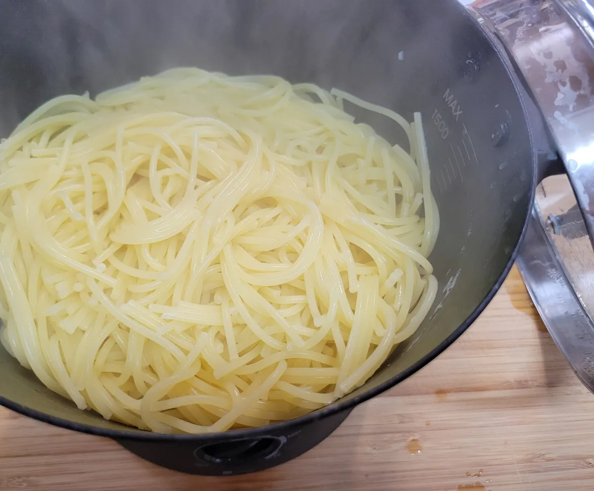 ⑥お湯を切ったら調理ポットを熱源に戻し温度を【MID】に設定し、④で炒めておいた具材とオリーブオイル(絡みやすくする為)をパスタに加え絡めながら軽く炒める。