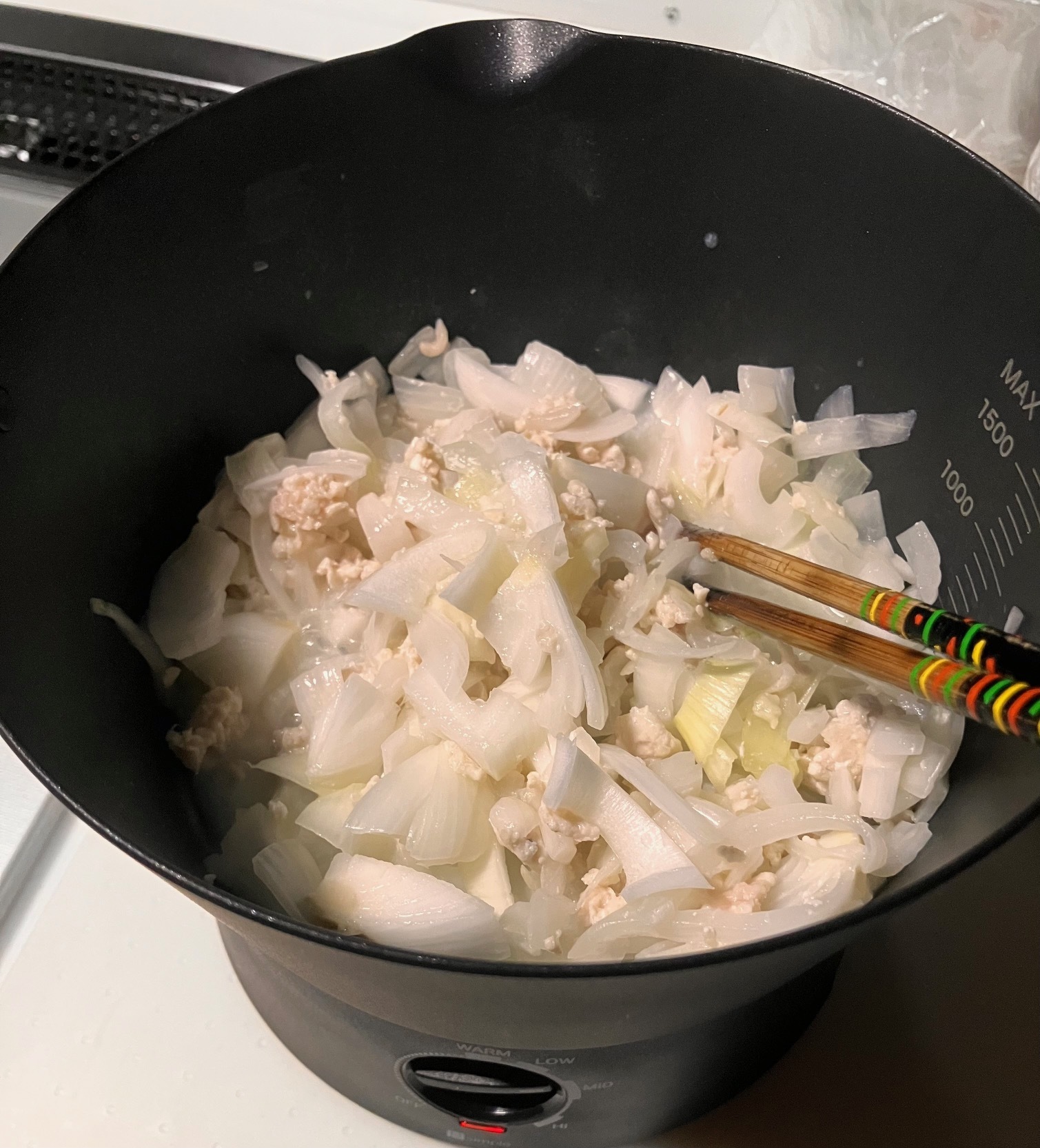 ①玉ねぎと鶏ミンチを炒める