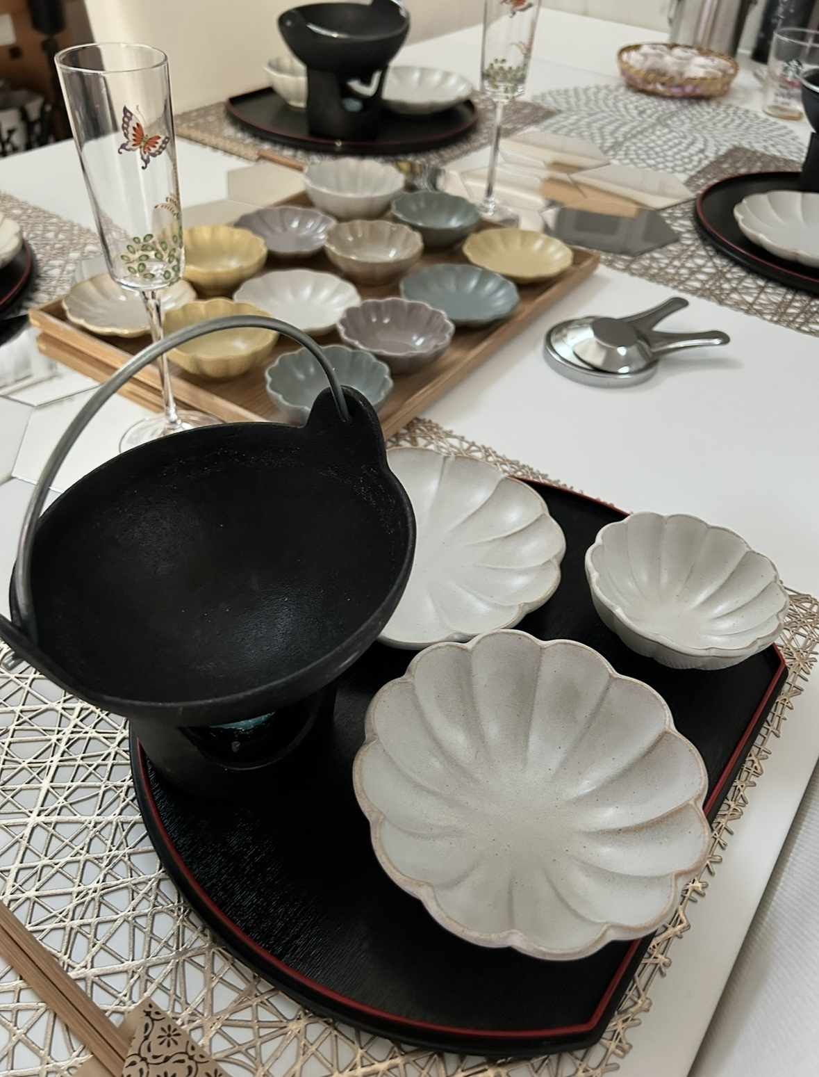 お花の形の小鉢は1つだけでも可愛いですが、こんな風にちょっとずつ取り分けたおせちがズラッと並ぶと、めちゃくちゃお洒落で豪華に見えますね!✨️