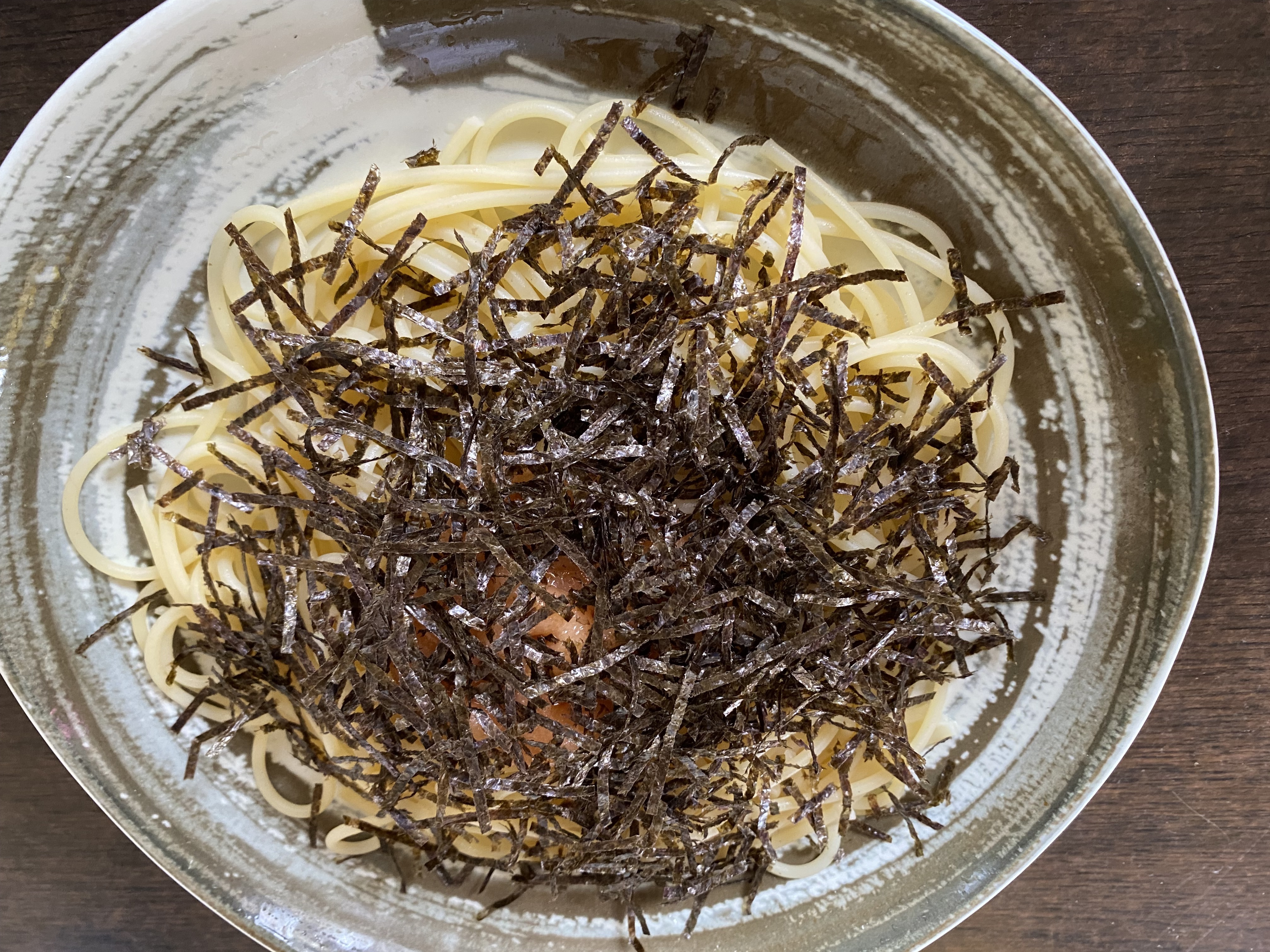 7️⃣お皿にパスタを盛り、たらこと刻み海苔をかけ出来上がり