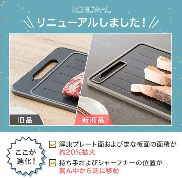 2024年9月の発売以来、メディアでも大きな反響を呼んだ「1枚4役 解凍プレート シャープナー おろし 付き まな板」が、お客様の声をもとにより使いやすさを追求してリニューアルしました✨