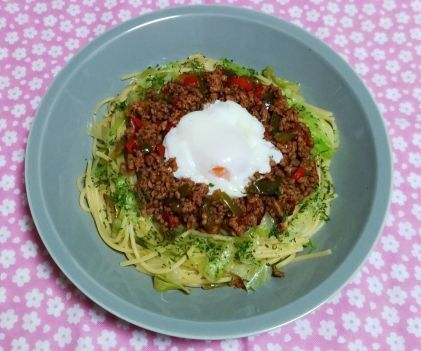 ✨温泉卵のせタコス風パスタ✨を作りました