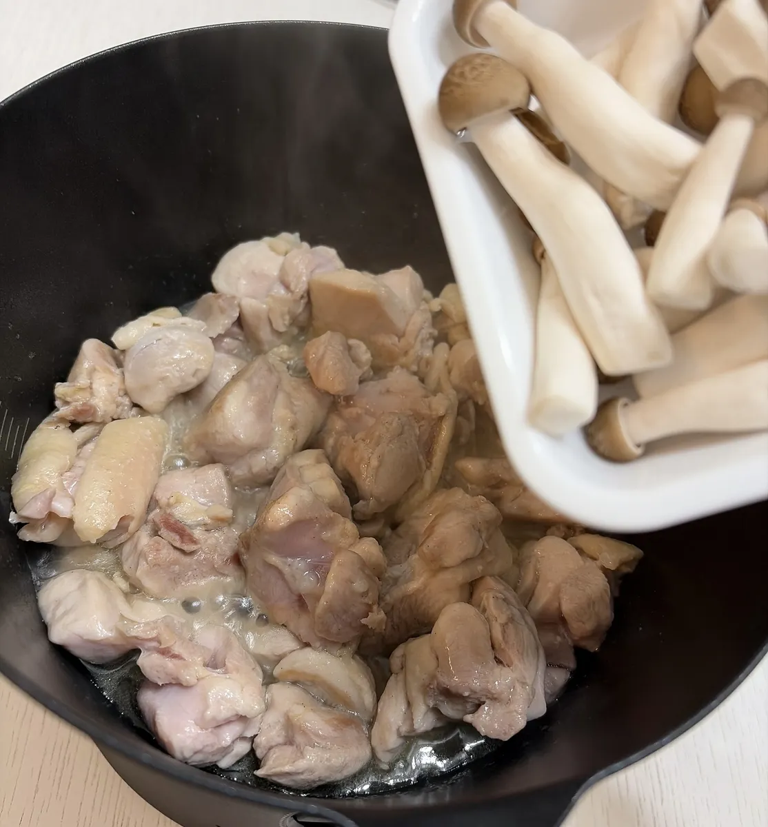 ⚪︎焼き目が付いてきたらしめじを入れます