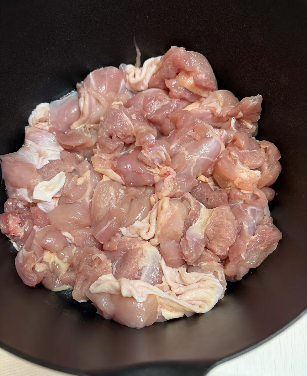 ⚪︎角切りに切った鶏もも肉2枚分を入れて焼いていきます