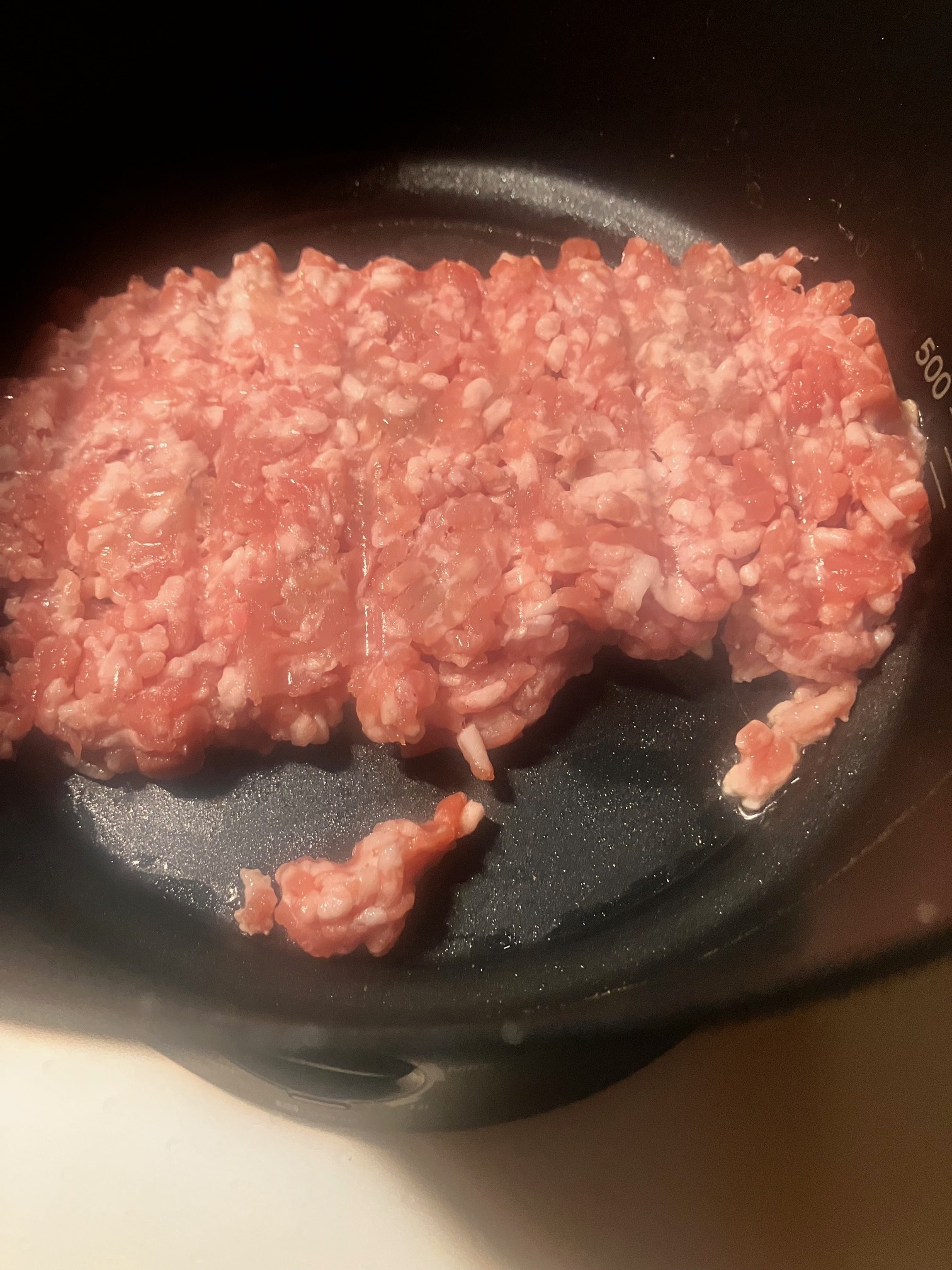 油をいれ 豚ミンチを炒めてゆく