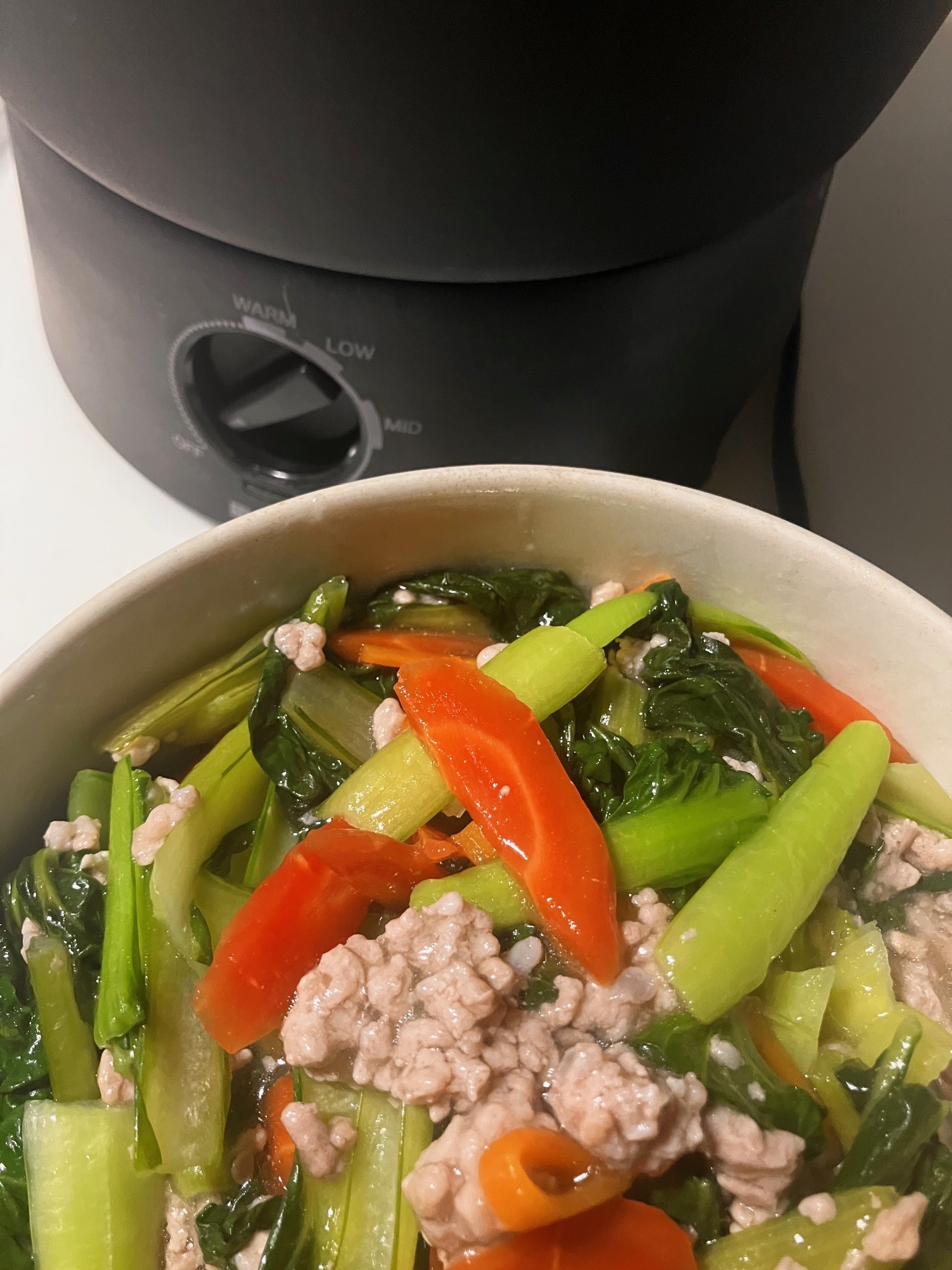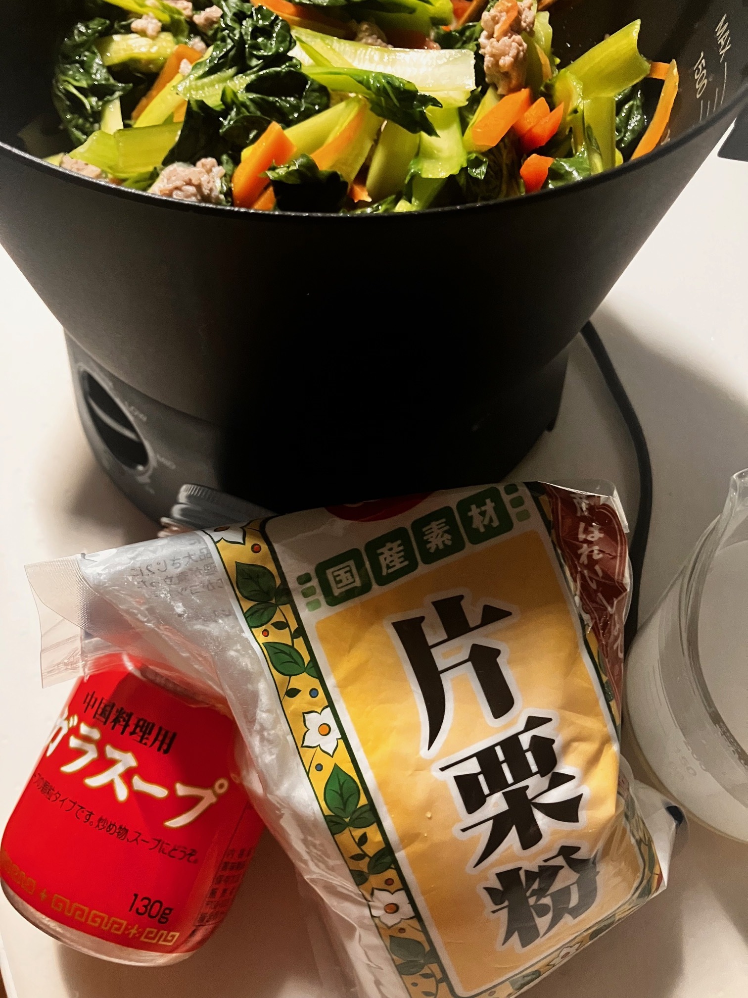 ターツァイ 🥕 豚ミンチ🐖 生姜(チューブ) 片栗粉 ガラスープ