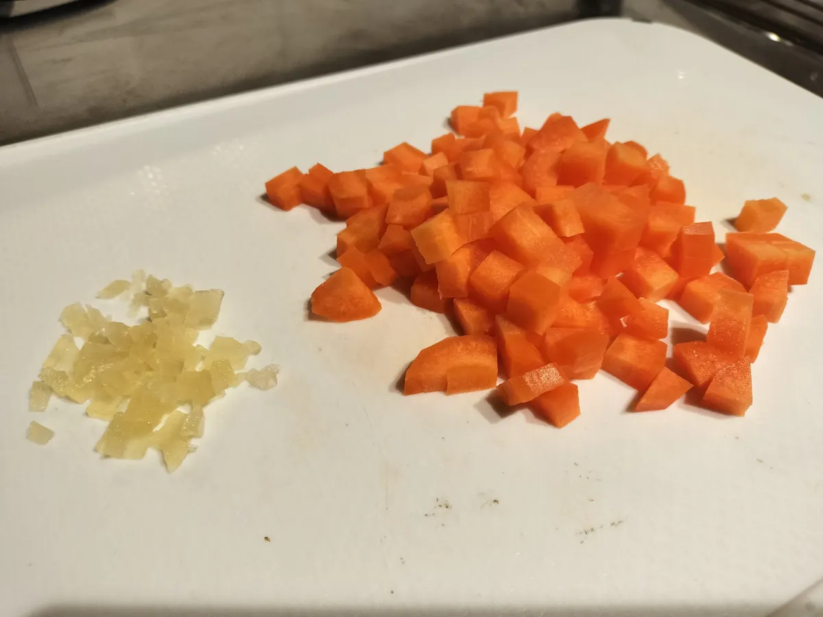 ①にんにくはみじん切り、にんじんは1cm角にカット