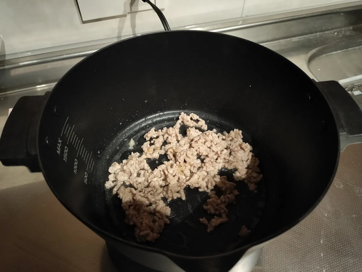 ②油でにんにくを炒め、香りが出てきたらひき肉投入