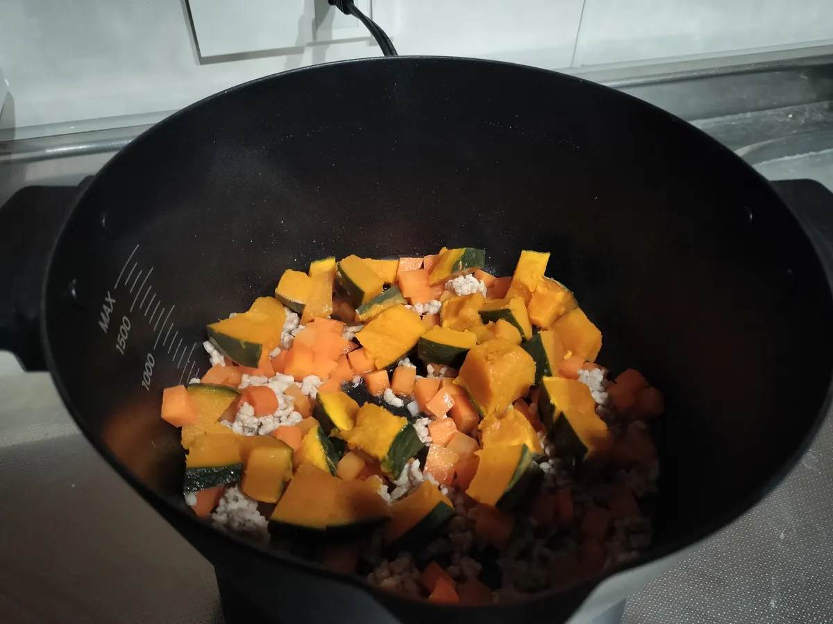 ③肉が色づいたらカボチャとにんじんを投入して軽く焼き目がつくまで炒める