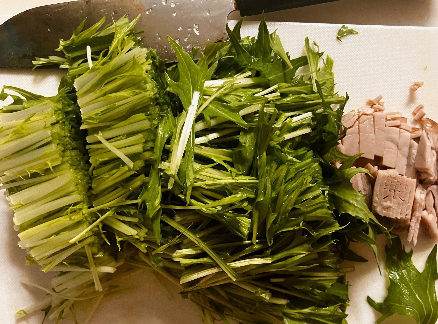 ⑦水菜とハムをカット→水菜は茹でておく