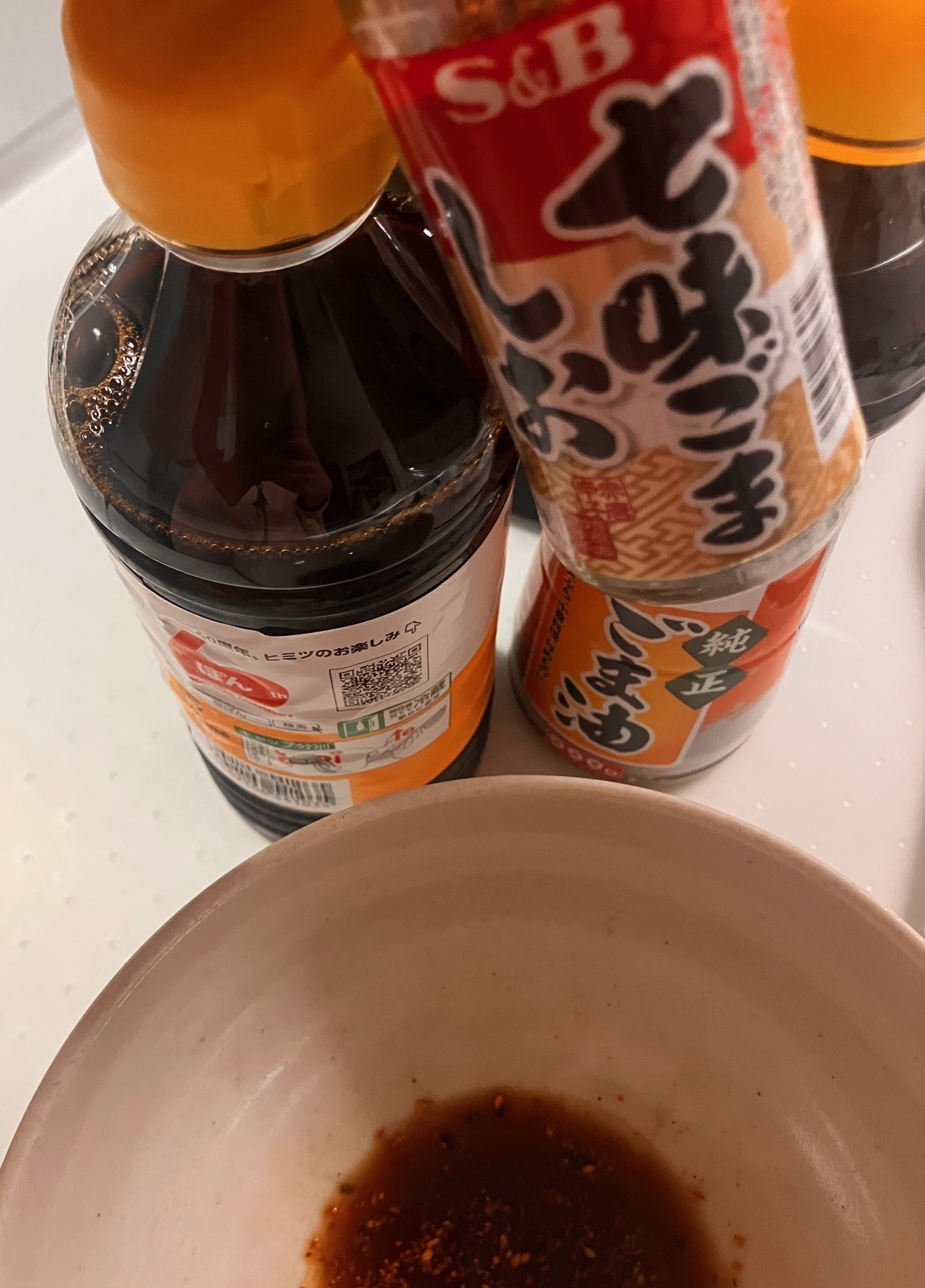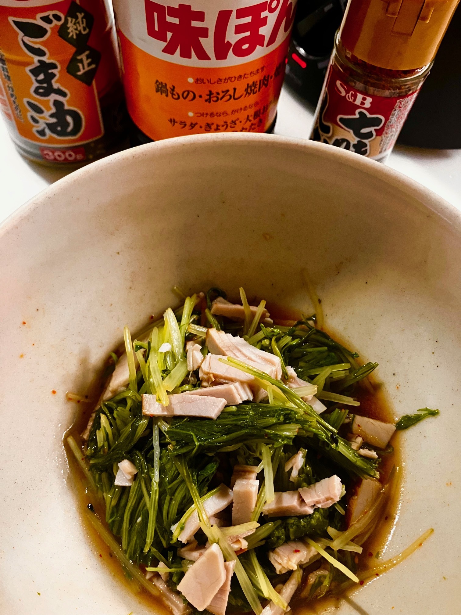 ⑧容器にポン酢 七味ごま塩 ごま油を入れ 水菜とハムを和える