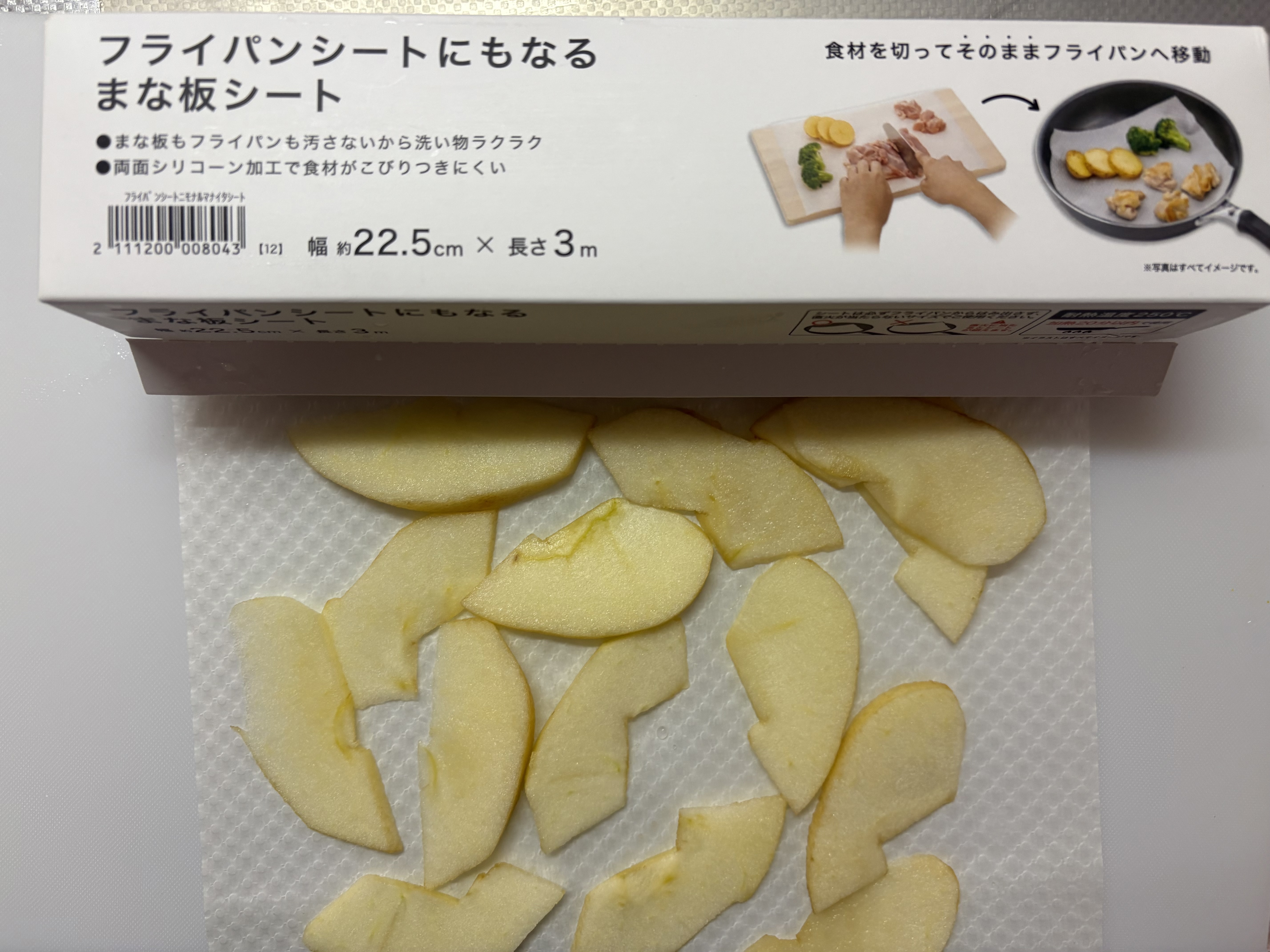 1.まな板シートhttps://www.nitori-net.jp/ec/product/2111200008043s/の上でりんごを薄くスライスします