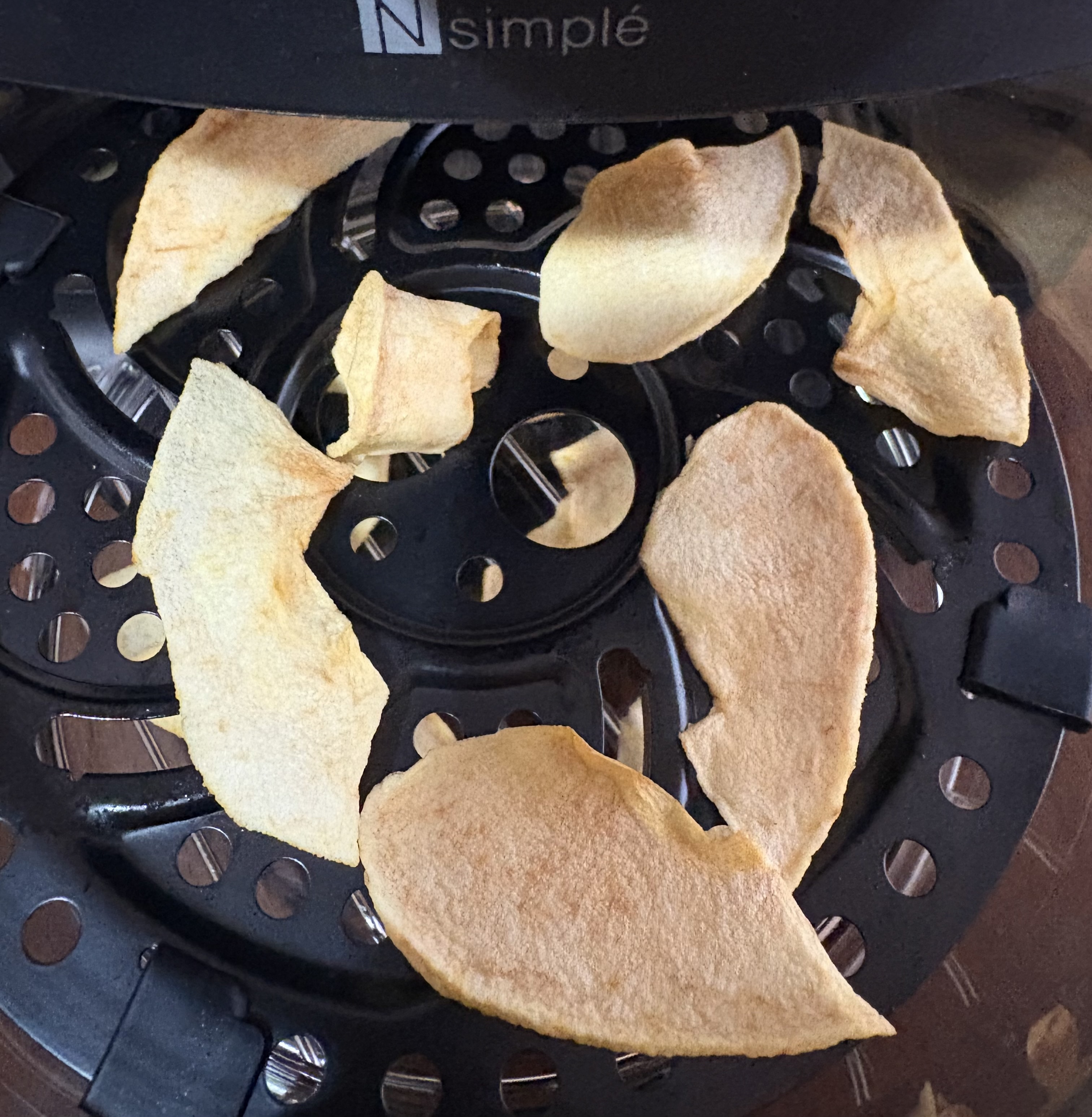 ↑えーっと、りんご少ししかありませんが、これにはワケが。出来上がりの「チーン」という音が鳴り、主人が「できたでぇ〜」と教えてくれたのですが、もう既にりんごチップスをつまんでおり、「写真撮ってないからアカ〜〜ン‼️」と私が叫んだ時には数枚、口の中に入ってました💦「パリパリでうまいでぇ〜」とのこと(´Д`)ハァ…