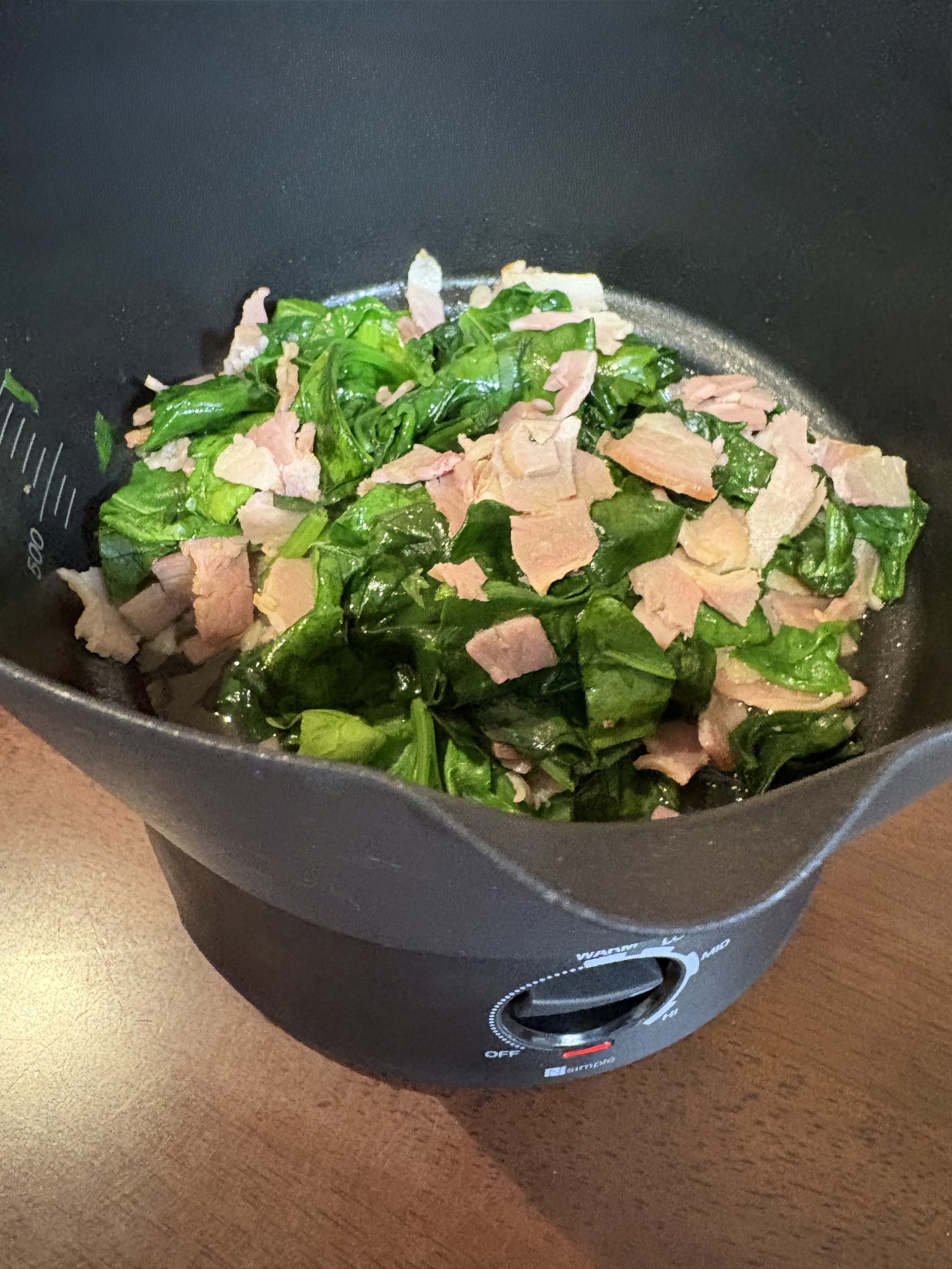 1.[一台10役マルチ調理ポット]https://www.nitori-net.jp/ec/product/2113400054059s/で、ベーコン、ほうれん草を炒めます