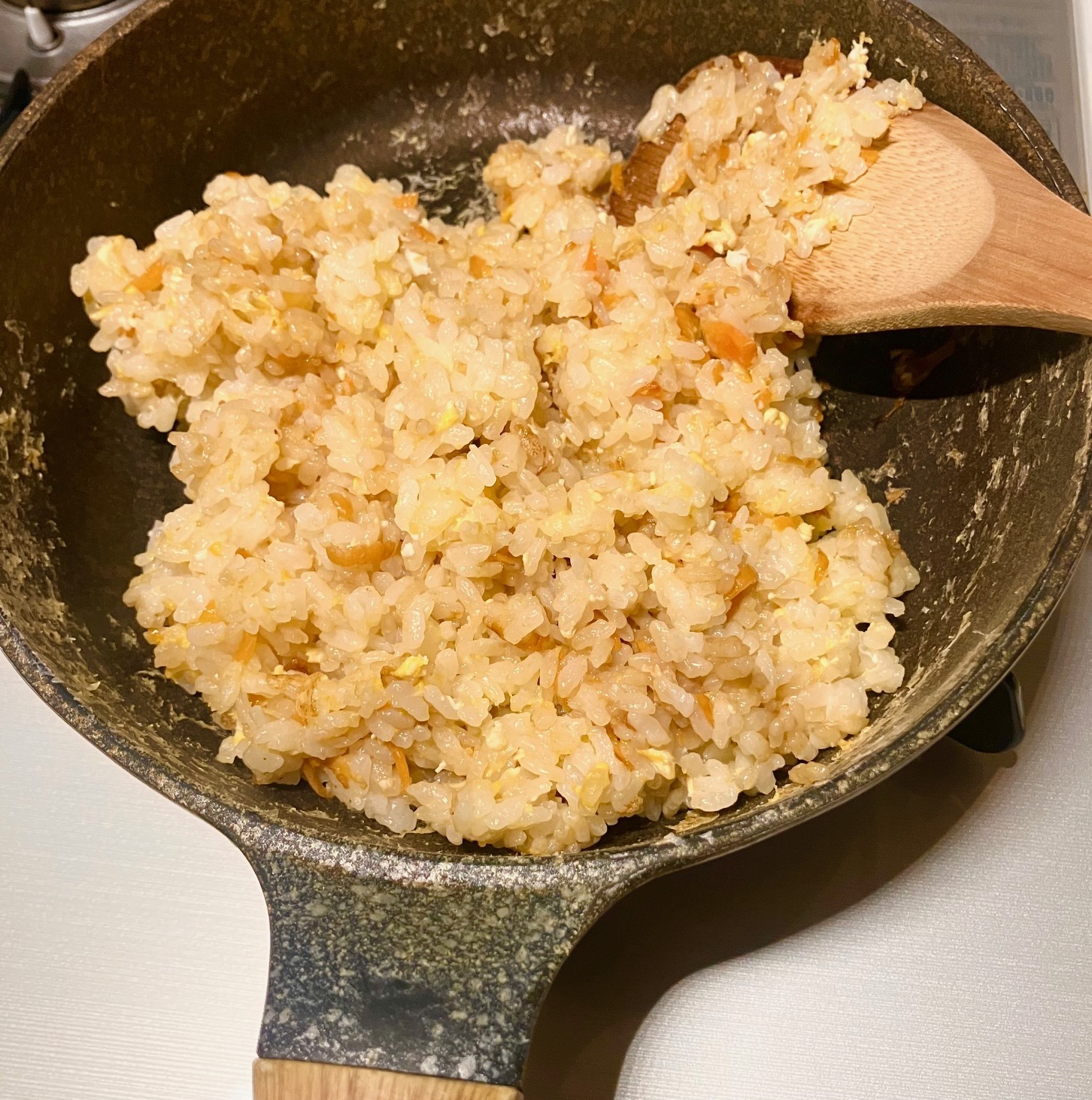 ②火が通れば 炊いたご飯に溶き卵を混ぜる