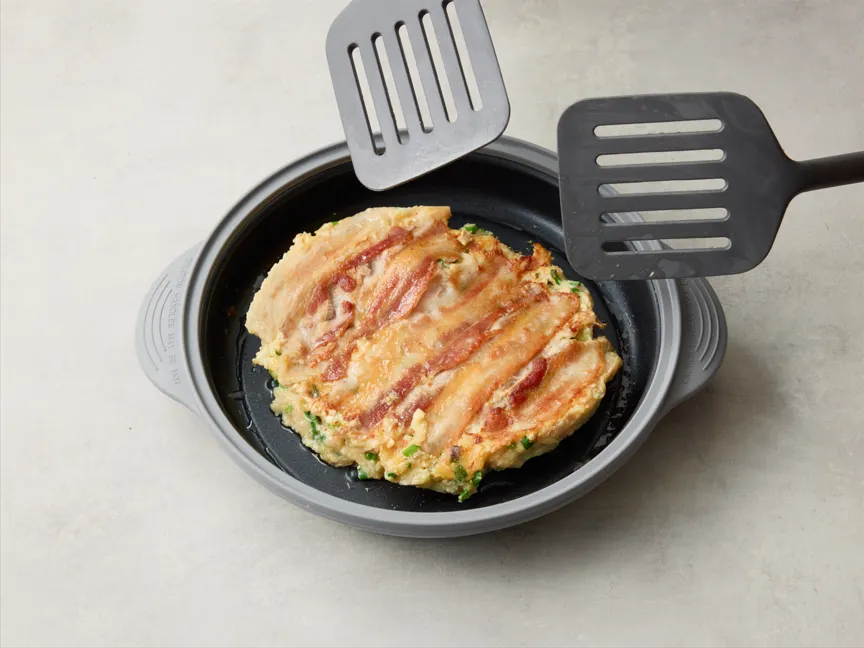 ➋ COPANレンジグリルに豚バラ肉を並べ、➊を流し入れ、ヘラで丸く形を整える。蓋をしてレンジで5分加熱する。(600w)