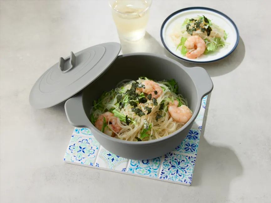 ➋ 加熱が終わったら湯切りして冷水で締め、水気をよく切る。ざるを外し、シリコーンポットの中に春雨、えび、2センチ幅に切った水菜を入れる。春雨が長い場合はキッチンバサミなどを使って食べやすい長さにカットする。
