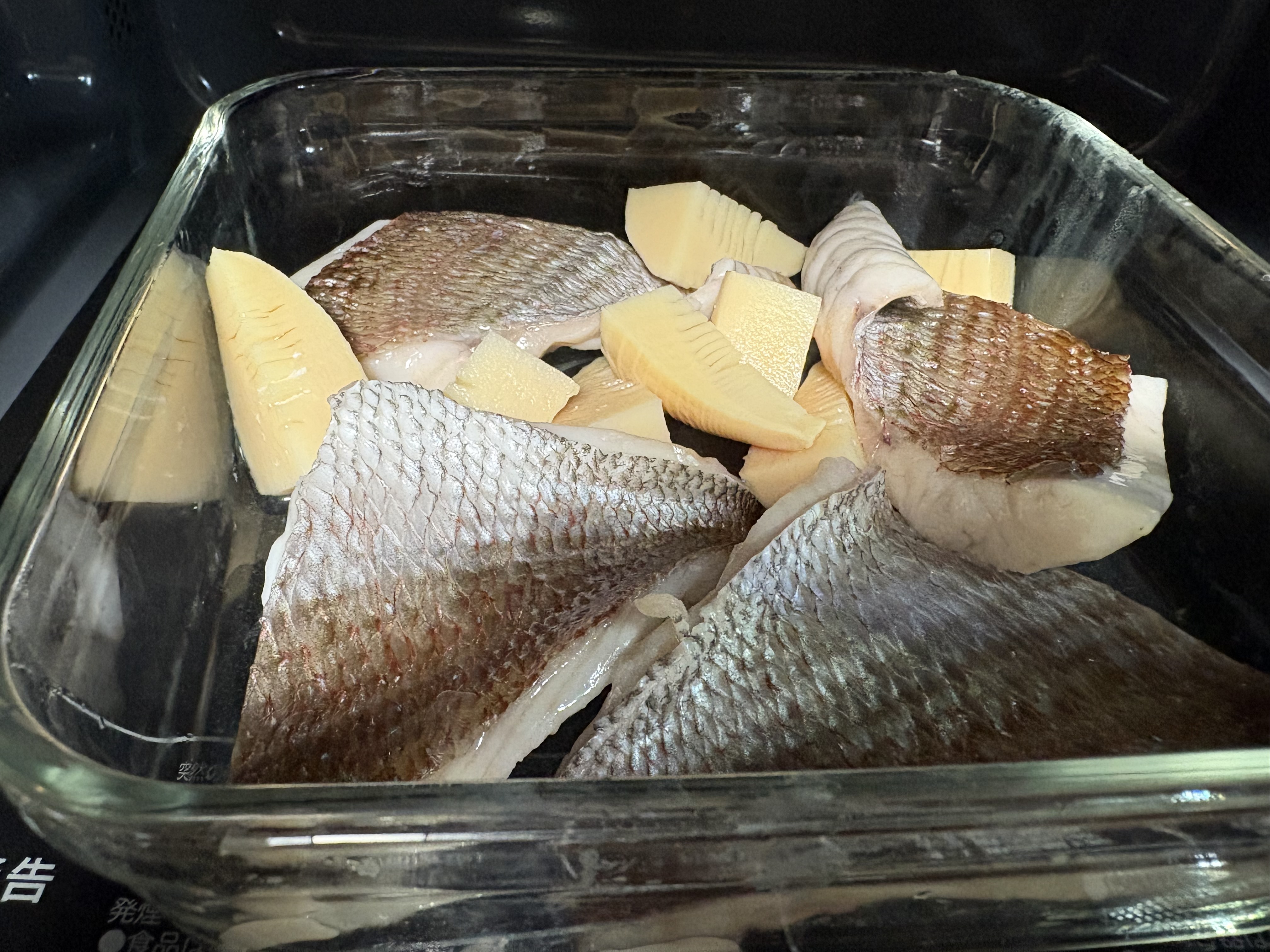 2.耐熱容器に鯛が重ならないように並べ、お酒をたっぷりかけ、ボイルしたたけのこがあれば一緒に入れて、蓋またはラップをして600wで5分チンします。