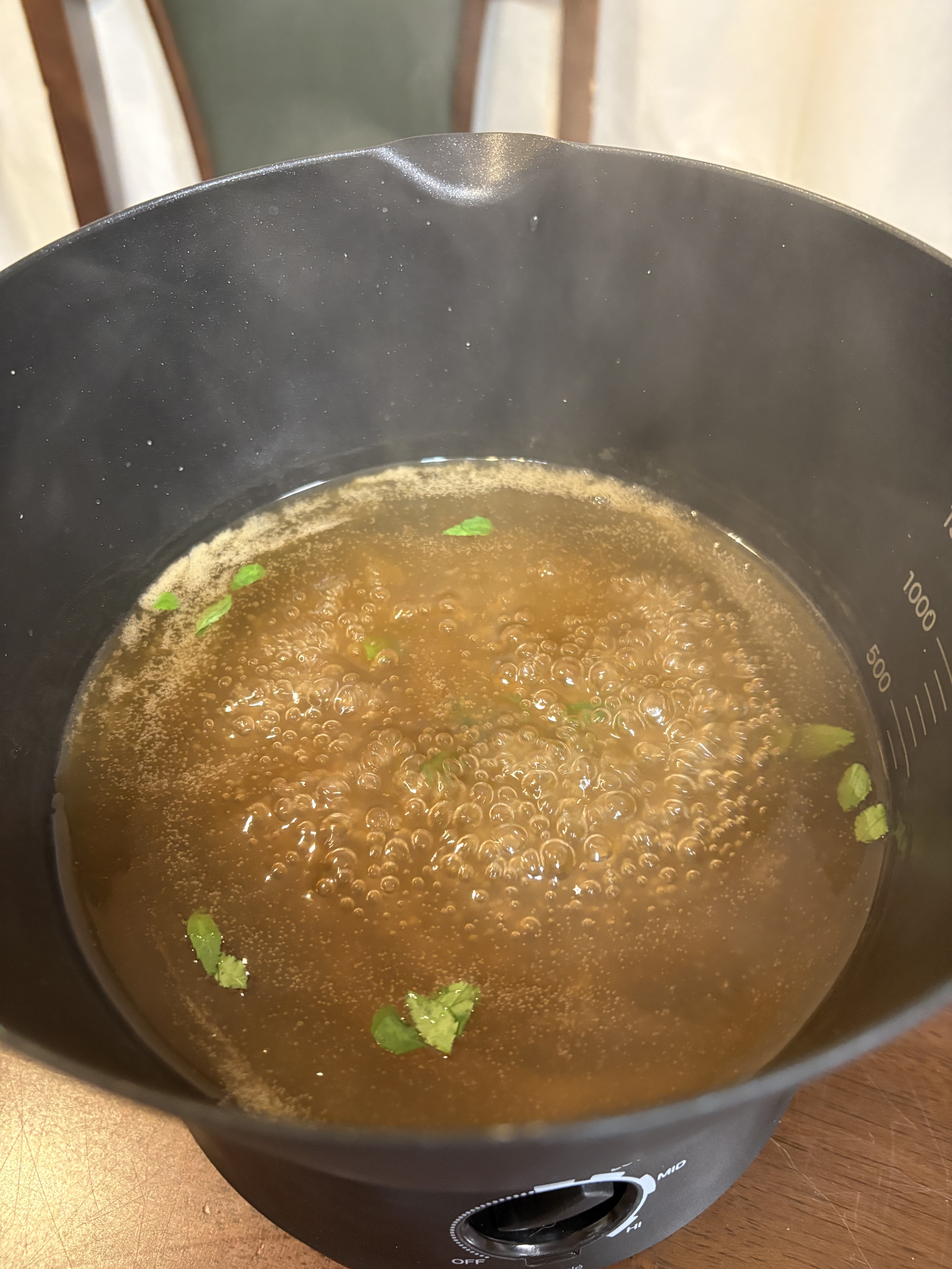3.チンしてる間に[一台10役マルチ調理ポット]で餡を作ります。出し汁に酒を入れて沸騰させたら、お醤油、お塩を入れて更に沸騰させます。水溶き片栗粉で餡にして、火を止めたら刻んだ木の芽を入れます。(味付けはちょっと濃いめの方が美味しいですよ☺️)
