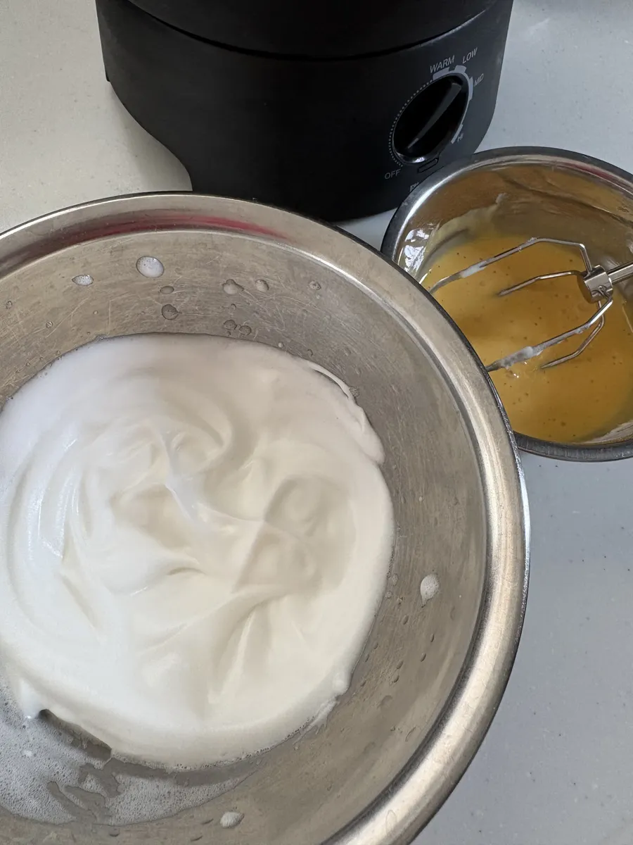 ◾︎メレンゲと卵黄が入ったボールを混ぜ合わせます。この時メレンゲを潰さないように!