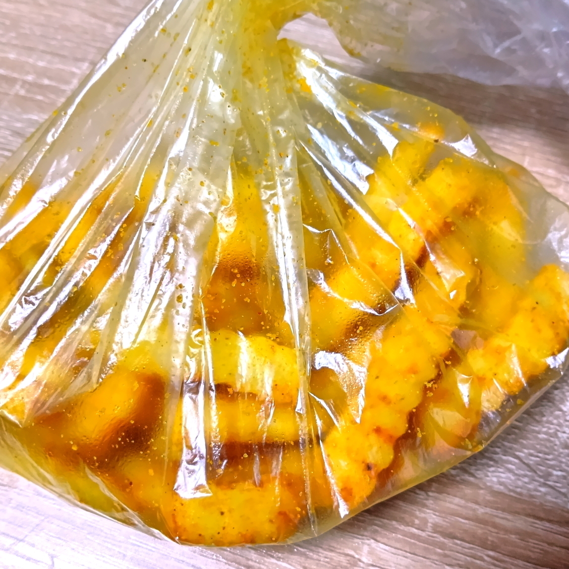 - ポリ袋(アイラップなど)に調味料を入れ、ポテトを加えて振ります。