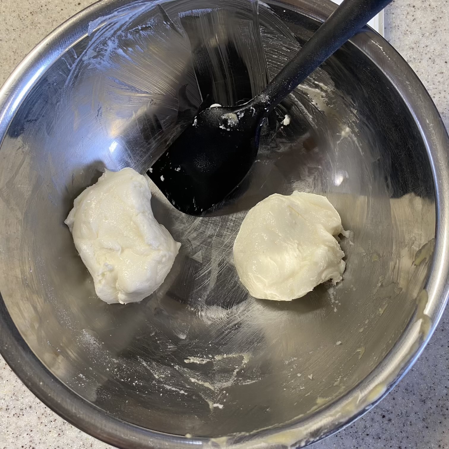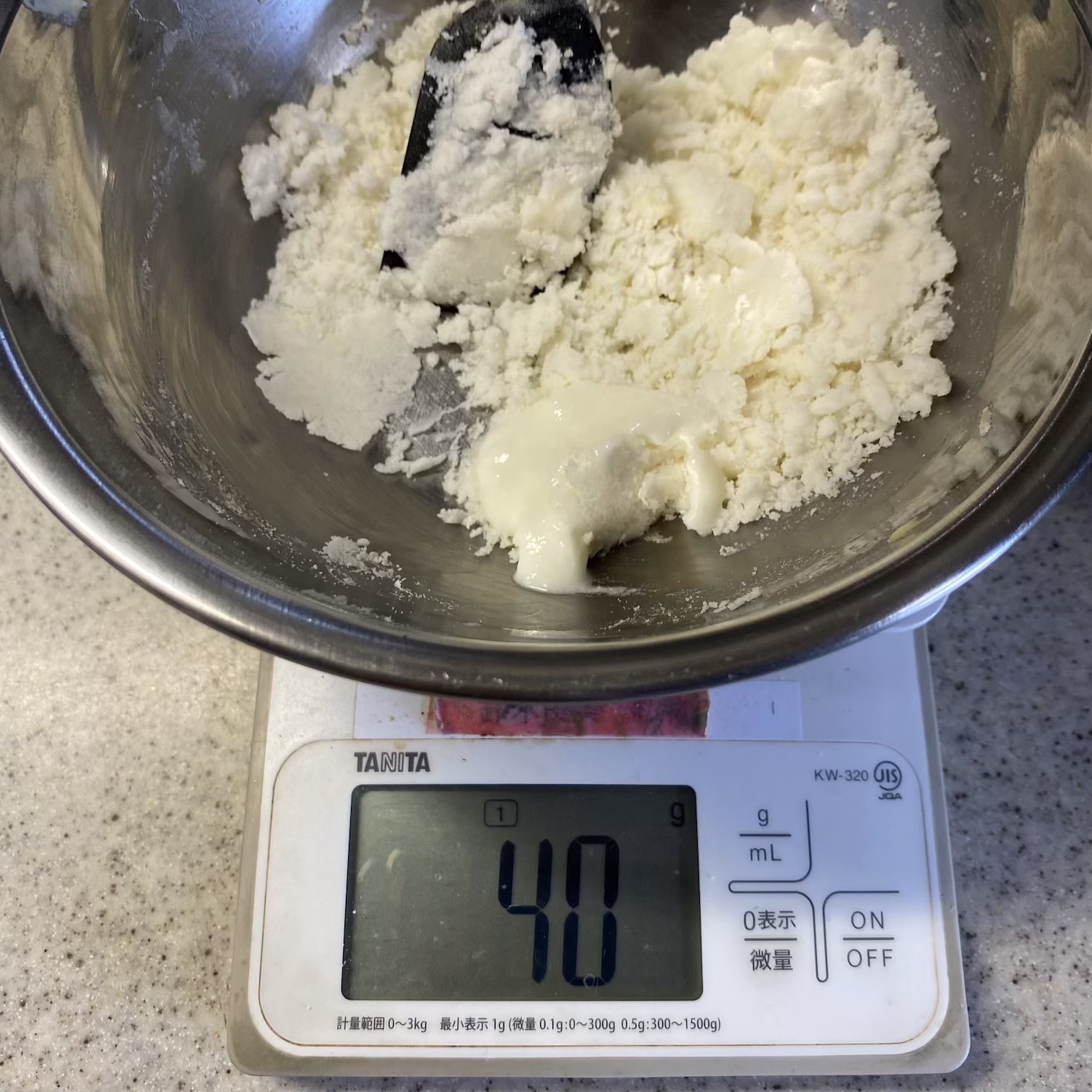 2️⃣ヨーグルトを加えて混ぜる。米粉の種類によっては量が前後します。なので少し残して加減する。