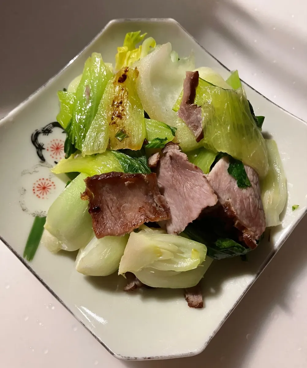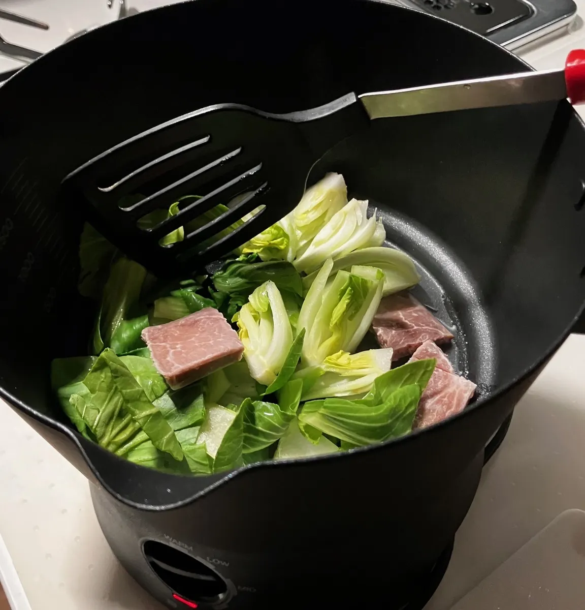 MIDとLOWの間くらいの火加減にして 青梗菜とハムを炒める