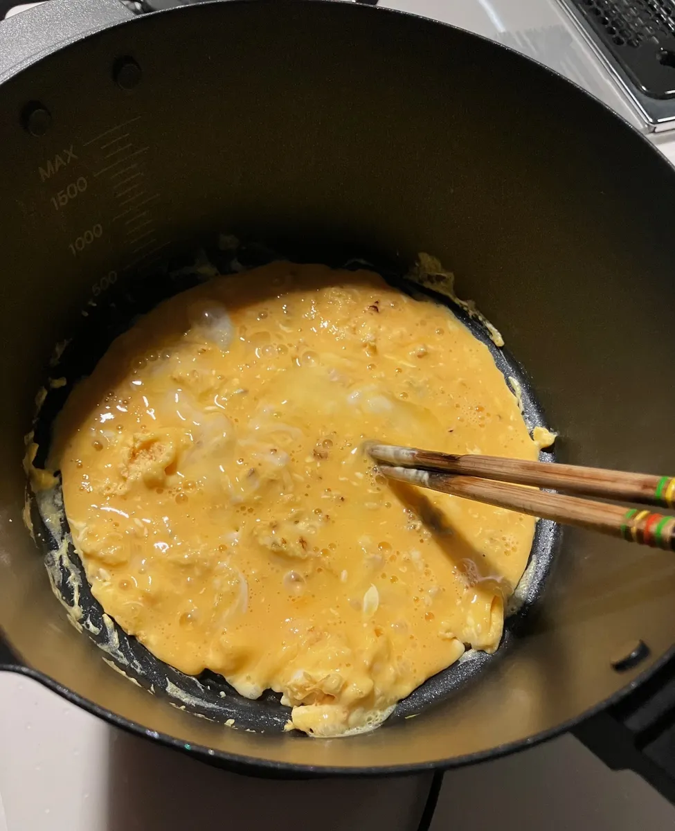 卵二つに マヨネーズを大匙1 入れて良くかき混ぜて 鍋へ