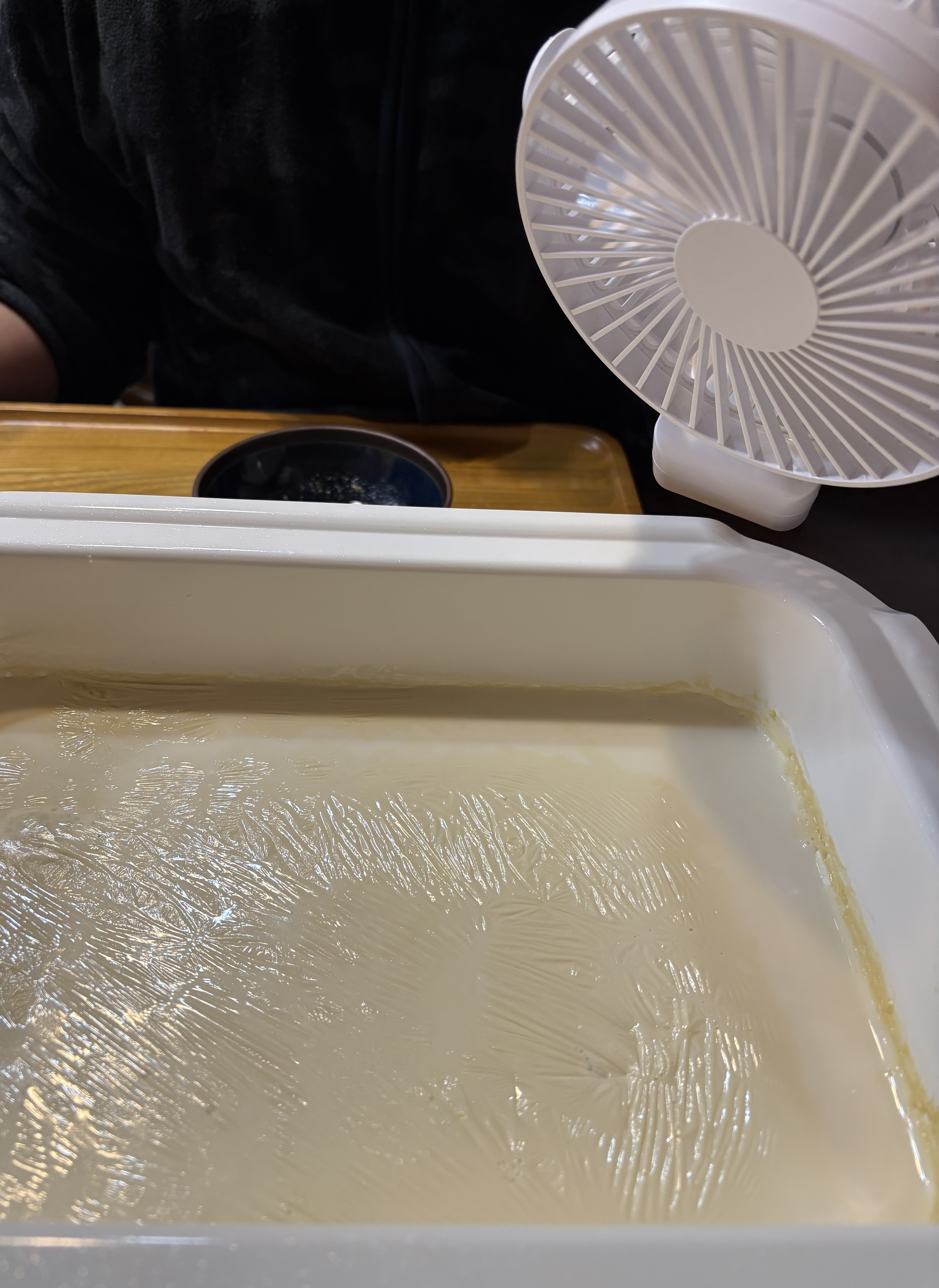 お鍋に豆乳を投入し、クリップファンで風を送ると約30秒で湯葉ができます😋