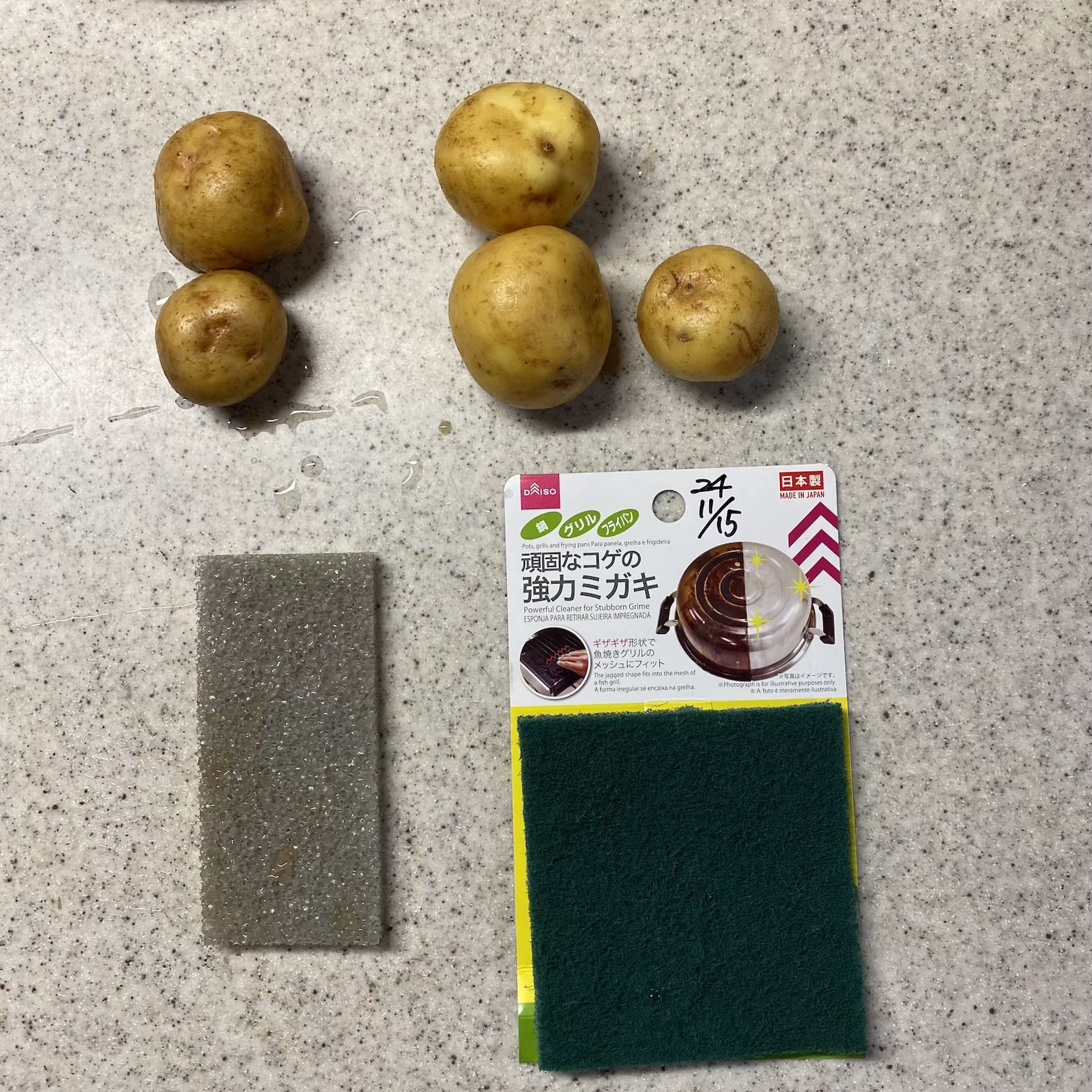 コゲ落としだとこすり取れる。右の3個が皮をこすり取った🥔。