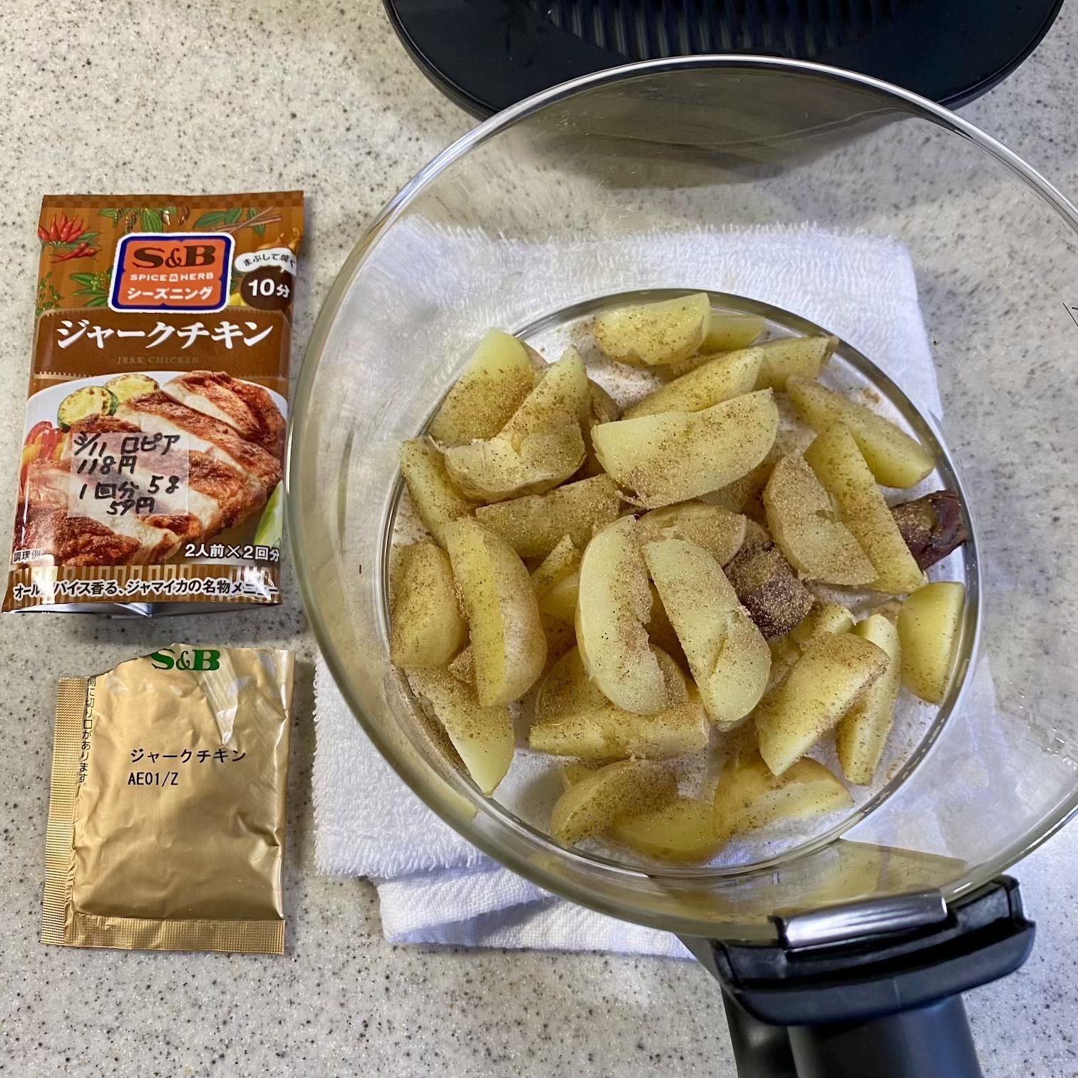 ノンちゃんのガラストレーに入れてS&Bジャークチキンの粉を1/2袋振りかける。