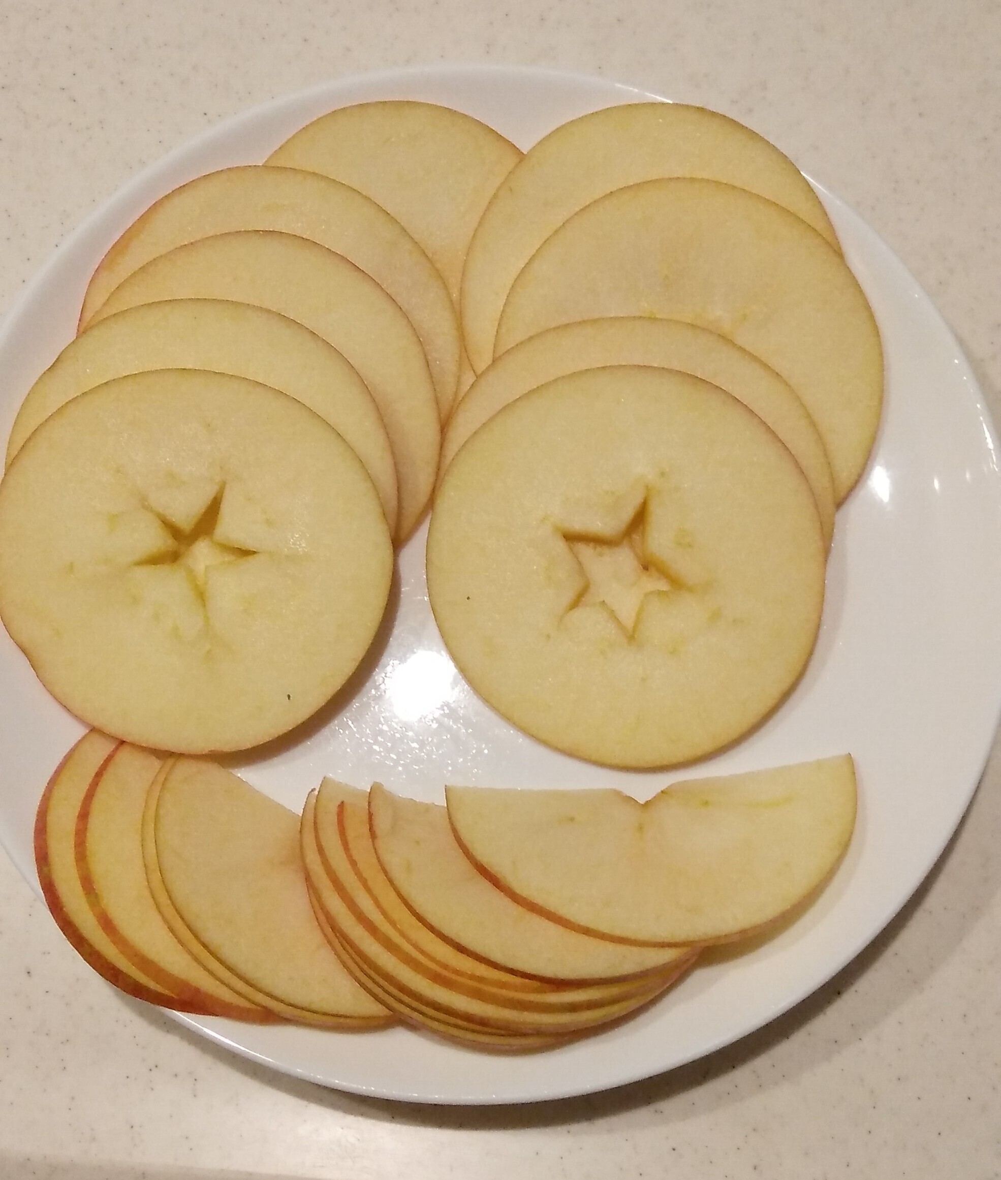 りんごをうすく切る。スターカットにしました☆スライサーないので均一ではないのが後々響きます。片面にうっすらバター塗りました。