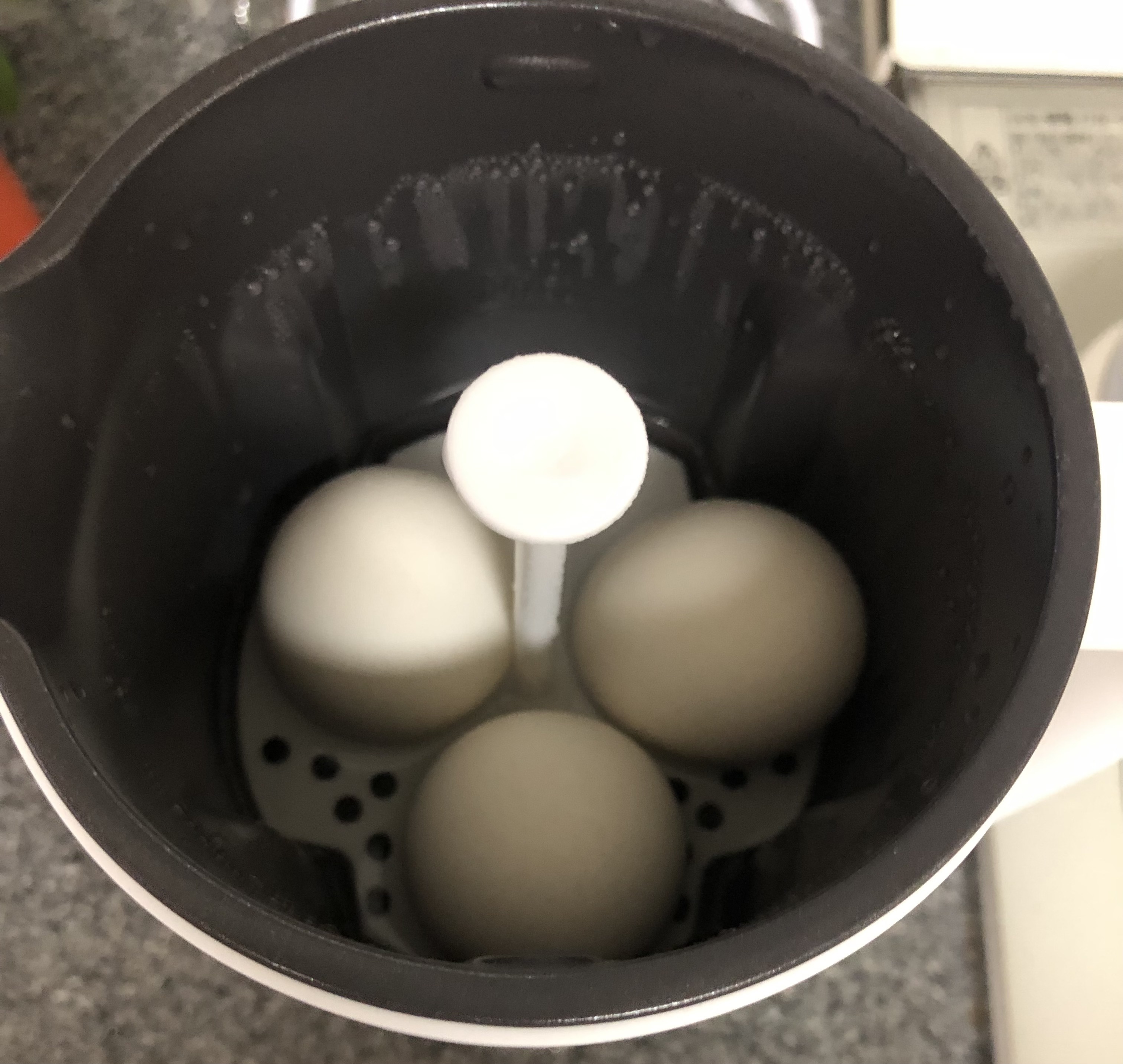 卵をエッグスタンドにセットして水を少し入れてゆで卵モード12分
