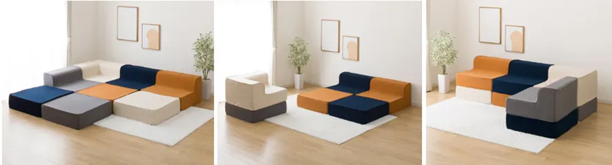 「マルチブロックソファ」は、ライフスタイルにあわせて、複数のユニット(3形状×4色)から自由に選んで購入し、組み合わせて使うことができるソファです。中材はウレタンのみの構造。軽量ですが、クッション性のあるしっかりした座り心地に仕上げました。
