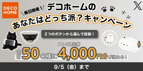 【終了】【 X で投稿 】あなたはどっち派?デコホームキャンペーン🎉 皆さん、こんにちは。今回は、ニトリチャンネルのみなさんにもぜひ知っていただきたいキャンペーンのご案内です♪現在、X(旧ツイッター)で「デコホームキャンペーン」を開催中です!Xを使っていない方も、機会があればぜひご参加ください👍 ボタンをクリックするだけで投稿ができるので、毎日でもできます!
