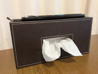 ティッシュケース リビングに置いてあるティッシュケース。リモコンと奥の収納に小物を入れることができます。収納の底にはそれぞれ高さ調節のための仕切りが入っていたのですが、潰れてしまったのでいまは使っていません。皮のような質感で高級感があり、部屋になじんでくれています。