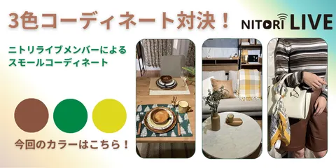 3色コーディネート対決!🔥みなさんの投票で勝者を決定! 皆さんMOI!(こんにちは)🌞 ニトリLIVEチームのRubyです💎本日は「みなさんの投票で決まる!!3色コーディネート対決!」をお届けします💌ルールは『ニトリの商品を、決められた3色でコーディネートする!』です! こちらの企画は勝ち残り制となっていますので、今回の優勝者は次回も参加となり