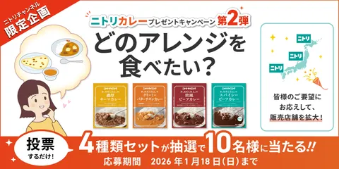 ニトリチャンネルでたびたび話題に上がっている「ニトリのレトルトカレー」ですが、みなさまのご要望にお応えして販売店舗が拡大されることになりました🎉(販売店舗一覧は下へスクロールしてコメント欄で確認できます👇👇) 記念として、豪華レトルトカレー4種類セットが抽選で10名様に当たるキャンペーン第