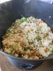 納豆好きはチャーハンにもめっちゃ入れます。納豆の栄養を考えると🆖料理だけど美味いもんはうまい😋材料(一人前)にんにくチューブオリーブ油スティックブロッコリー🥦納豆2️⃣パックご飯🍚一膳スパイス(塩コショウでも⭕️)作り方(マルチ調理ポットはMIDで調理してます)1、2、3をお好みの量を入れてコー