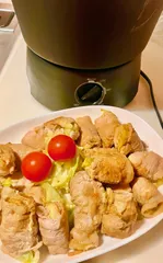 肉巻き🐖 マルチ調理ポットをつかって 肉巻き🐖を作りました 🔵材料薄切り🐖700㌘ぐらいキャベツ4分の1(千切りし レンチンしておく)厚揚げ(小さめにカット)小麦粉 🔵作り方①豚肉を広げて 厚揚げとキャベツをおいて 巻いていくただひたすら 巻いてゆく…巻き終わりの部分に 小麦粉をつける(適当でだいじょうぶw)