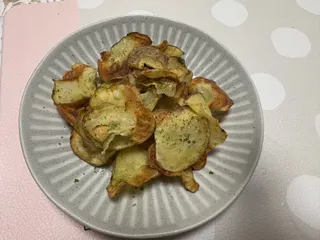 フライドポテトのついでに。 ノンオイルフライヤー(https://www.nitori-net.jp/ec/product/2113400056121s/)でフライドポテトを作ったのでそのついでにもしかしてこれも作れるんじゃない??って思って作ってみましたよ😋その名もポテトチップス!!🥔材料は今回じゃがいも、塩、青のりです。