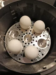 1台10役マルチ調理ポット 3回目です。そしてまたまた蒸し器利用 笑これしか使っていない。。万能すぎる! 今回は蒸し卵にしました!卵を並べて、お水をいれます。説明書にくぼみの下あたりまでって書いてあったので適当に お水から火をつけ、弱火で10分しっかり蒸し卵ができました!☺️&n