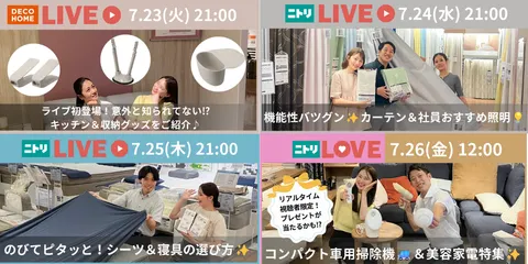 皆さんこんにちは🌞ニトリLIVEチームのきゃとです🐈 来週のニトリLIVEは、こちらのラインナップで配信予定です⭐️ 時間になりましたら↓から視聴いただけます!7/23(火):デコホームLIVE・意外と知られていない!?キッチン&収納グッズ特集7/24(水):ニトリLIVE・機能